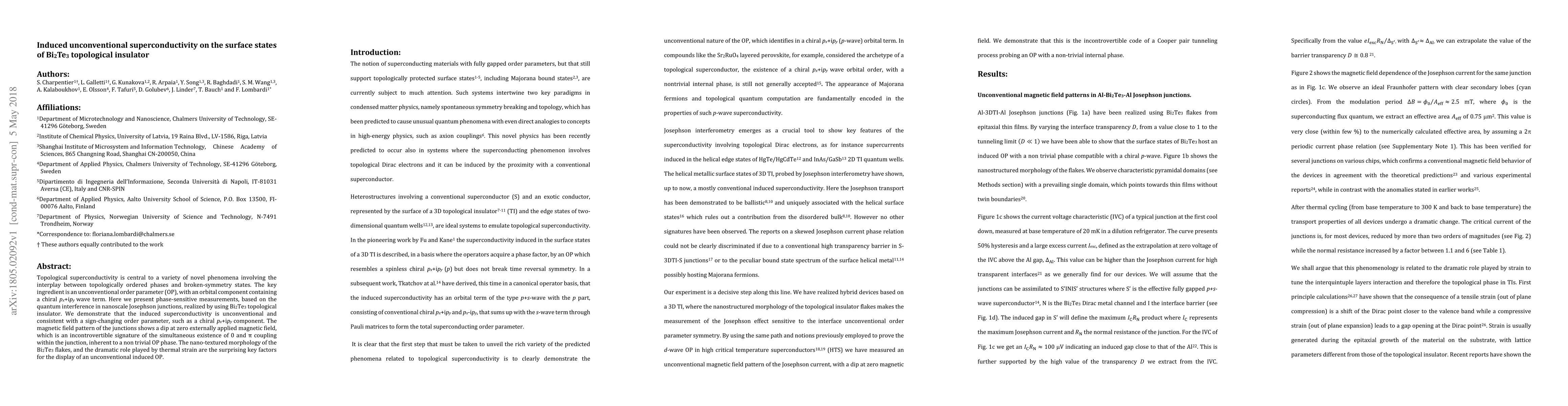 This study demonstrates induced unconventional superconductivity on the surface states of Bi$_2$Te$_3$ topological insulator, characterized by a chiral $p_x$ + i$p_y$ order parameter, through quantum interference measurements in nanoscale Josephson junctions. Thermal strain and nano-textured morphology are identified as crucial factors for this phenomenon.