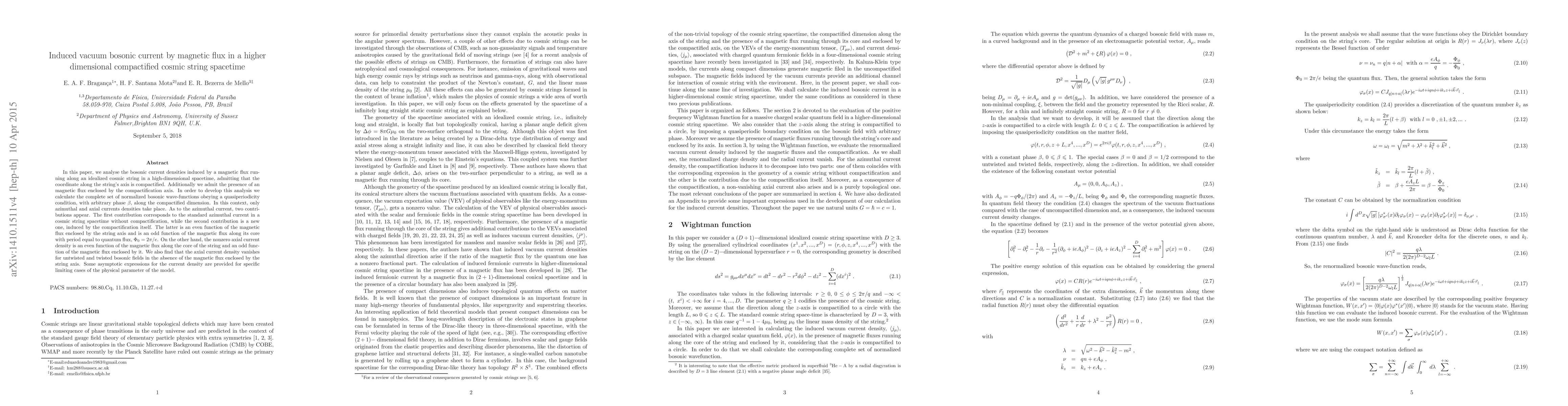 This paper investigates bosonic current densities induced by magnetic flux in a compactified cosmic string spacetime, deriving wave-functions and identifying two contributions to azimuthal current: a standard one and a new one from compactification. The axial current density is nonzero and depends on the magnetic flux configurations, vanishing without enclosed flux.