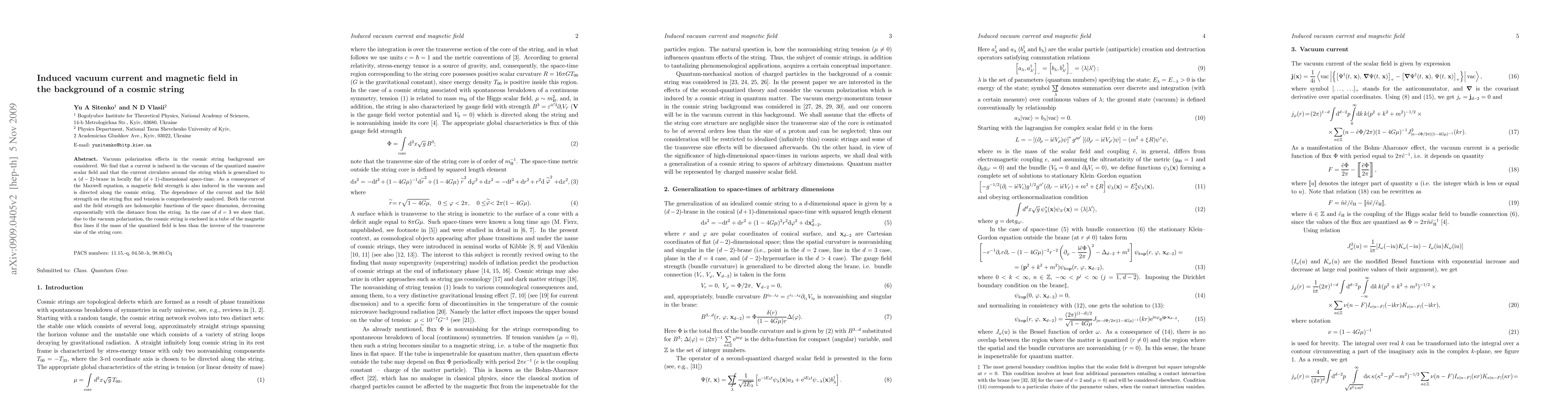 This research explores vacuum polarization effects around cosmic strings, revealing induced currents and magnetic fields. The study shows that these phenomena depend on string flux and tension, with current and magnetic field strength diminishing with distance, and in three dimensions, a magnetic flux tube forms around the string if the field's mass is smaller than the string's core size.