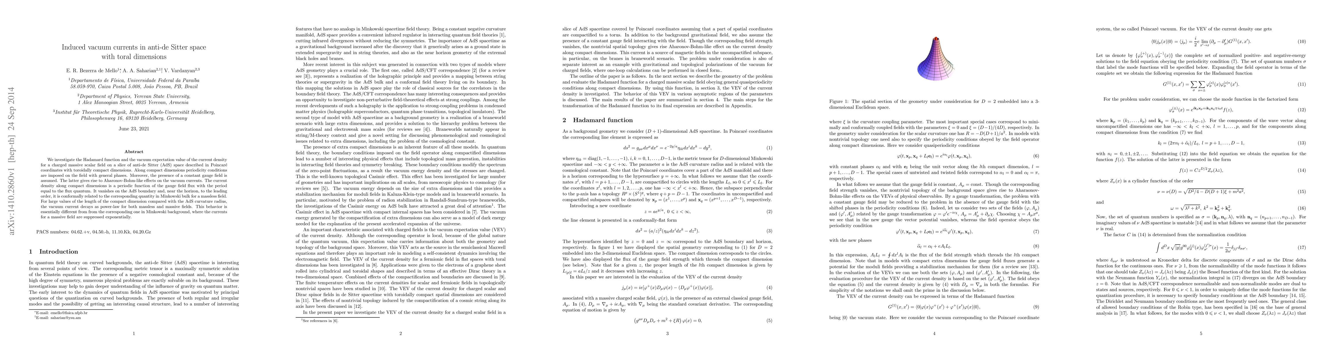 This paper examines the vacuum expectation value of current density for a charged massive scalar field in anti-de Sitter space with toroidal dimensions, revealing periodic vacuum currents influenced by a constant gauge field, and showing power-law decay for large compact dimensions compared to the AdS curvature radius.