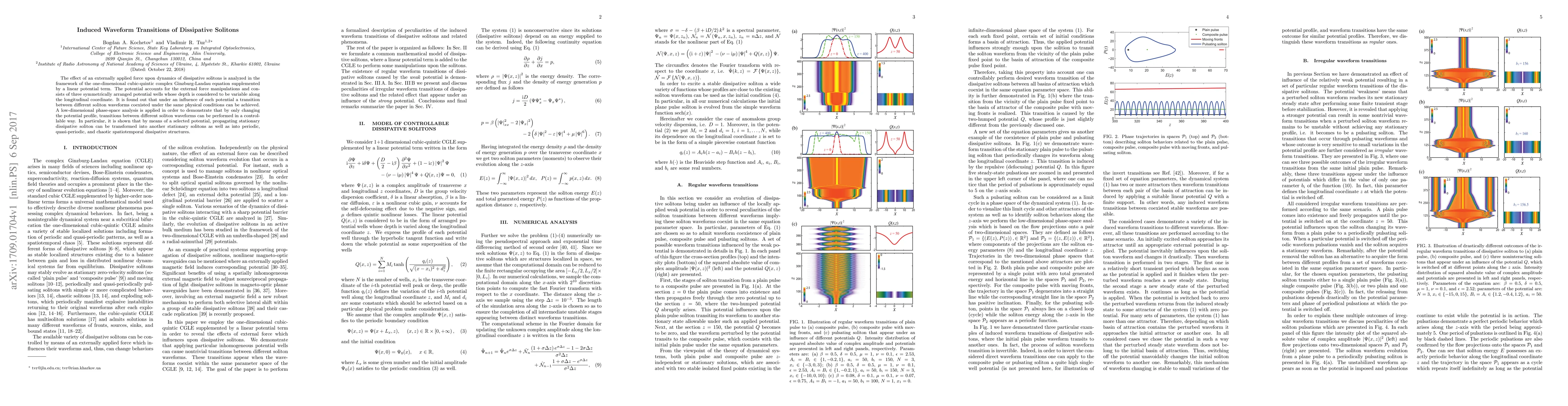 The effect of an externally applied force upon dynamics of dissipative solitons is analyzed in the framework of the one-dimensional cubic-quintic complex Ginzburg-Landau equation supplemented by a linear potential term. The potential accounts for the external force manipulations and consists of three symmetrically arranged potential wells whose depth is considered to be variable along the longitudinal coordinate. It is found out that under an influence of such potential a transition between different soliton waveforms coexisted under the same physical conditions can be achieved. A low-dimensional phase-space analysis is applied in order to demonstrate that by only changing the potential profile, transitions between different soliton waveforms can be performed in a controllable way. In particular, it is shown that by means of a selected potential, propagating stationary dissipative soliton can be transformed into another stationary solitons as well as into periodic, quasi-periodic, and chaotic spatiotemporal dissipative structures.