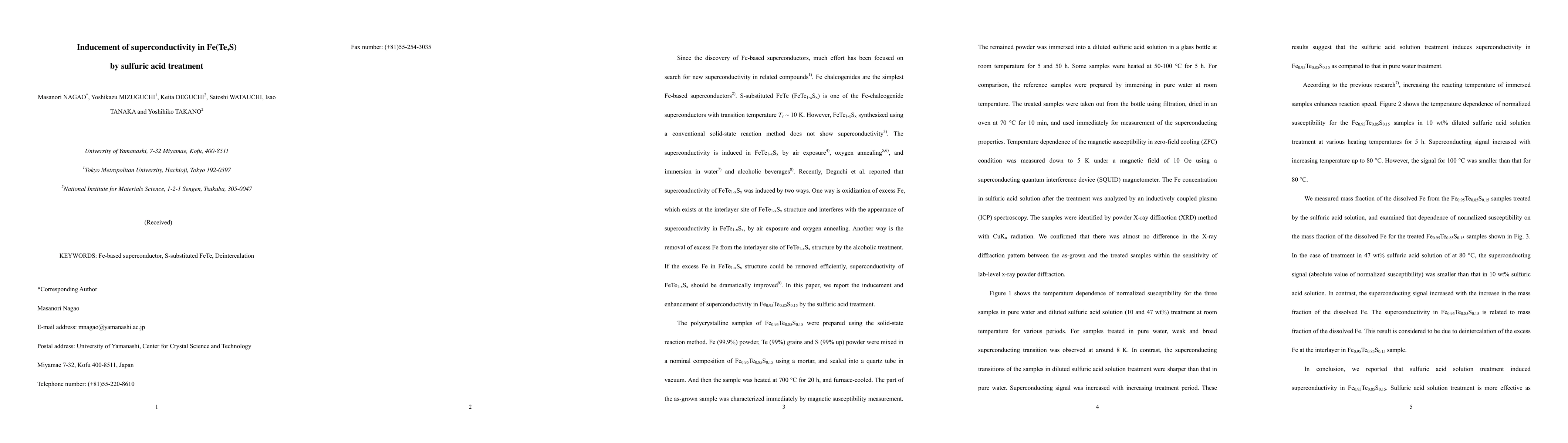 Superconductivity of Fe0.95Te0.85S0.15 was induced and enhanced by immersing the as-grown (non-superconducting) sample into sulfuric acid. Dissolved Fe was detected in the sulfuric acid treatment, indicating that excess Fe was removed from the Fe0.95Te0.85S0.15 sample.