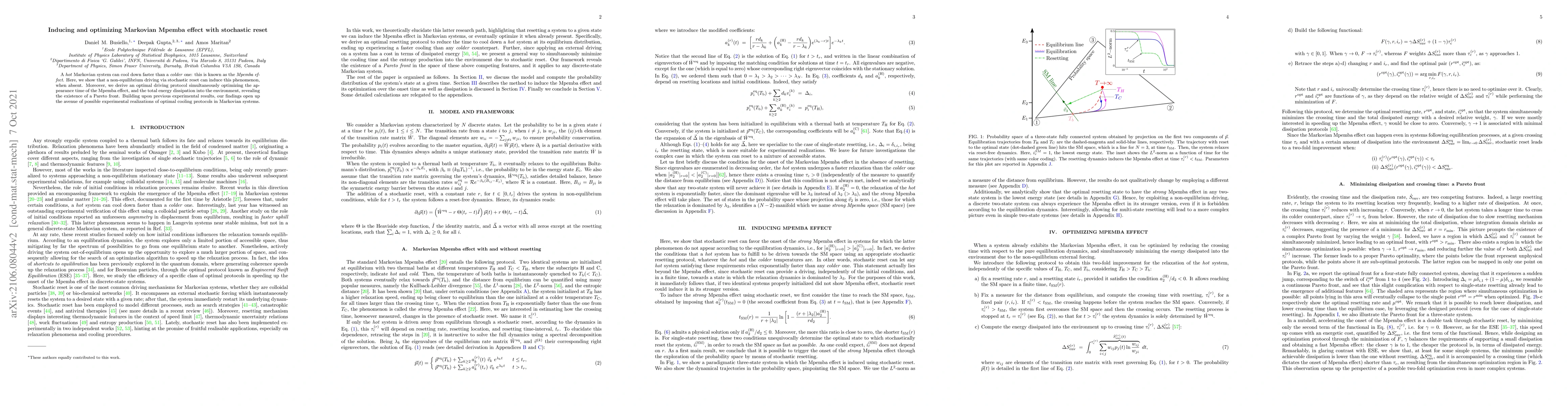 This paper demonstrates how stochastic reset can induce the Mpemba effect in Markovian systems, where a hotter system cools faster than a colder one. It also presents an optimal driving protocol that balances the timing of the Mpemba effect and energy dissipation, revealing a Pareto front.
