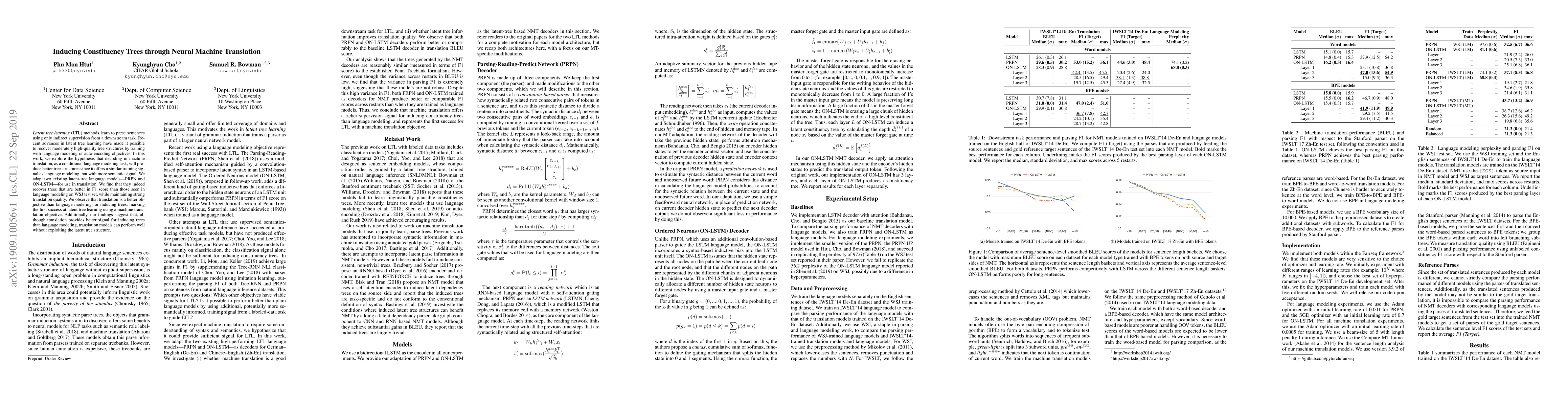 Researchers found that using machine translation as a task to induce constituency trees results in better tree structures than language modeling, while maintaining strong translation quality. This is the first success in latent tree learning using a machine translation objective.