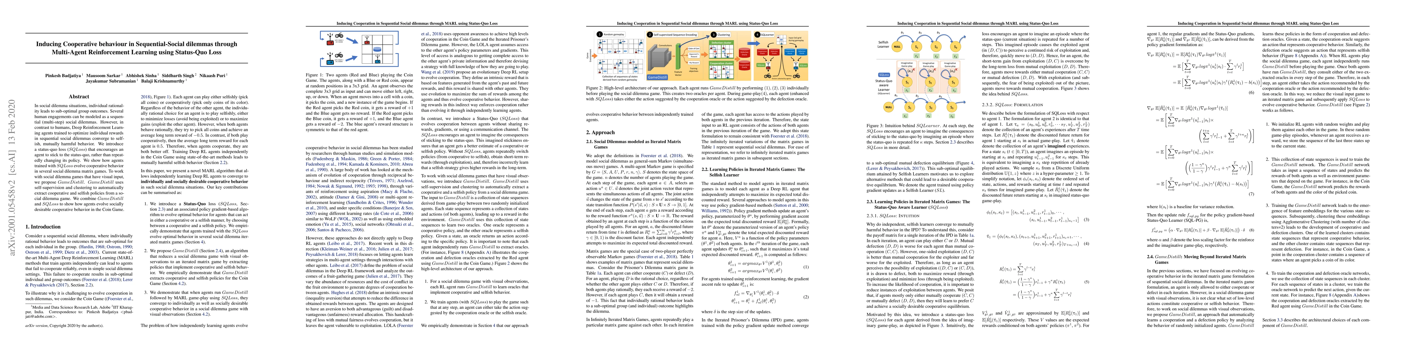 This paper introduces a status-quo loss (SQLoss) to encourage cooperative behavior in multi-agent reinforcement learning for sequential social dilemmas, leading to better group outcomes. It also proposes GameDistill for visual social dilemma games, combining both methods to foster cooperation in the Coin Game.