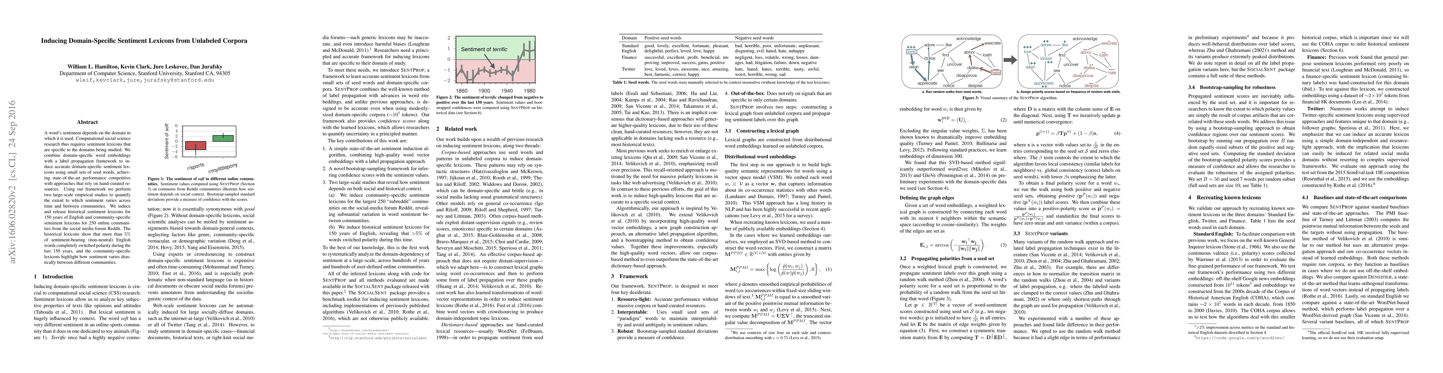 This paper presents a method to generate domain-specific sentiment lexicons from unlabeled data using domain-specific word embeddings and label propagation, achieving state-of-the-art performance. The study also reveals significant sentiment shifts over 150 years and substantial differences between online communities.