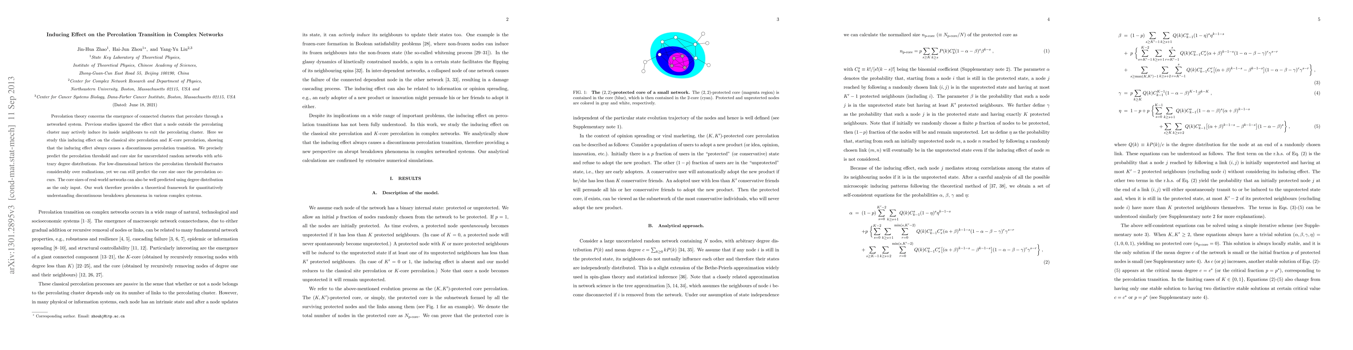 Percolation theory concerns the emergence of connected clusters that percolate through a networked system. Previous studies ignored the effect that a node outside the percolating cluster may actively induce its inside neighbours to exit the percolating cluster. Here we study this inducing effect on the classical site percolation and K-core percolation, showing that the inducing effect always causes a discontinuous percolation transition. We precisely predict the percolation threshold and core size for uncorrelated random networks with arbitrary degree distributions. For low-dimensional lattices the percolation threshold fluctuates considerably over realizations, yet we can still predict the core size once the percolation occurs. The core sizes of real-world networks can also be well predicted using degree distribution as the only input. Our work therefore provides a theoretical framework for quantitatively understanding discontinuous breakdown phenomena in various complex systems.