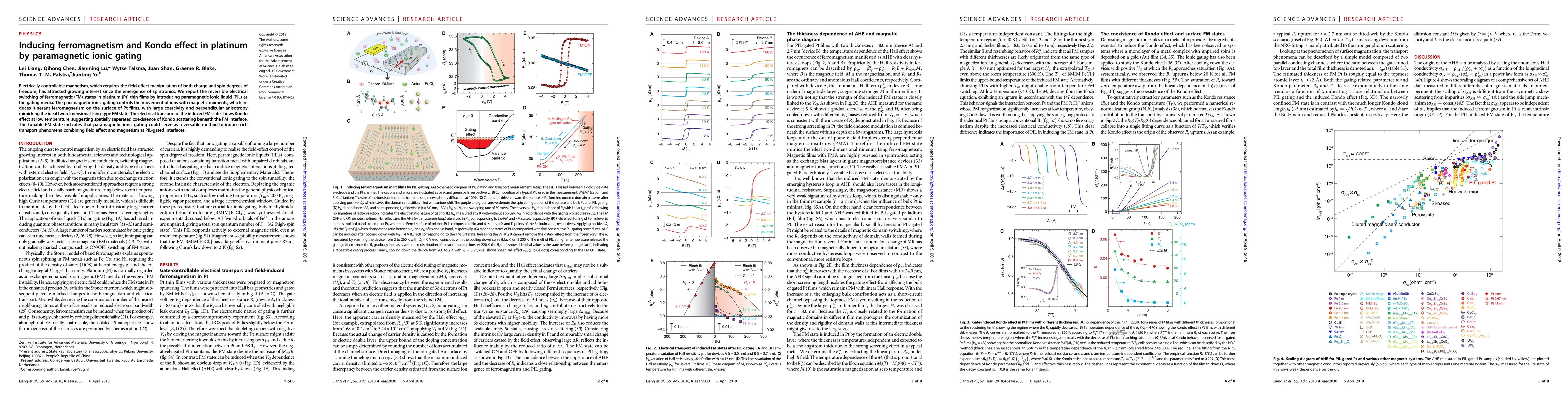 This research demonstrates electrically reversible ferromagnetic states in platinum thin films using paramagnetic ionic liquid gating, showing itinerant ferromagnetism with high coercivity and perpendicular anisotropy. The induced ferromagnetic state exhibits Kondo effect at low temperatures, suggesting the potential of paramagnetic ionic gating for versatile manipulation of magnetism and transport phenomena.