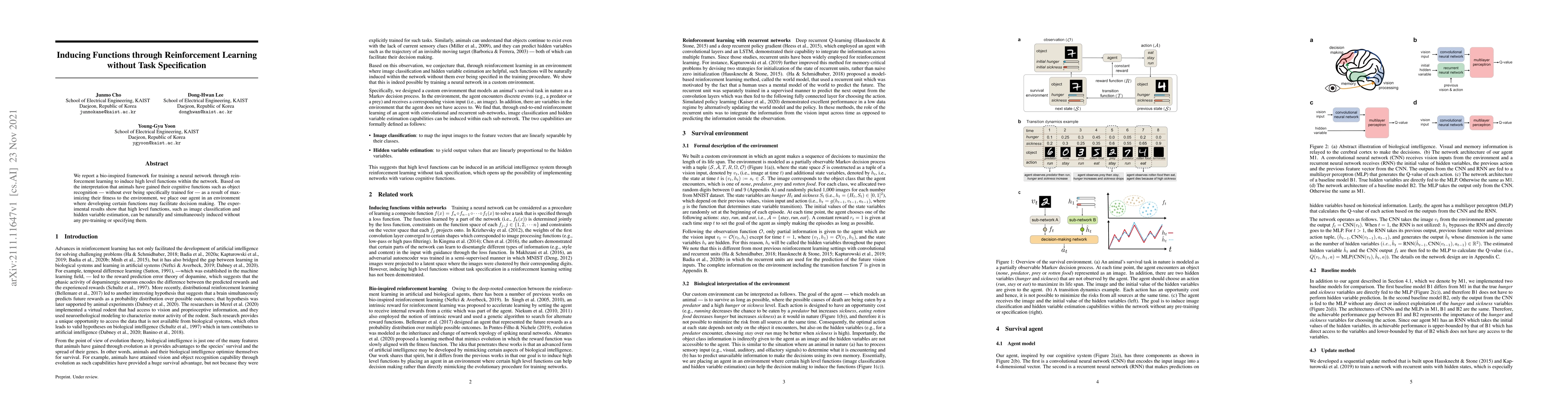 We report a bio-inspired framework for training a neural network through reinforcement learning to induce high level functions within the network. Based on the interpretation that animals have gained their cognitive functions such as object recognition - without ever being specifically trained for - as a result of maximizing their fitness to the environment, we place our agent in an environment where developing certain functions may facilitate decision making. The experimental results show that high level functions, such as image classification and hidden variable estimation, can be naturally and simultaneously induced without any pre-training or specifying them.