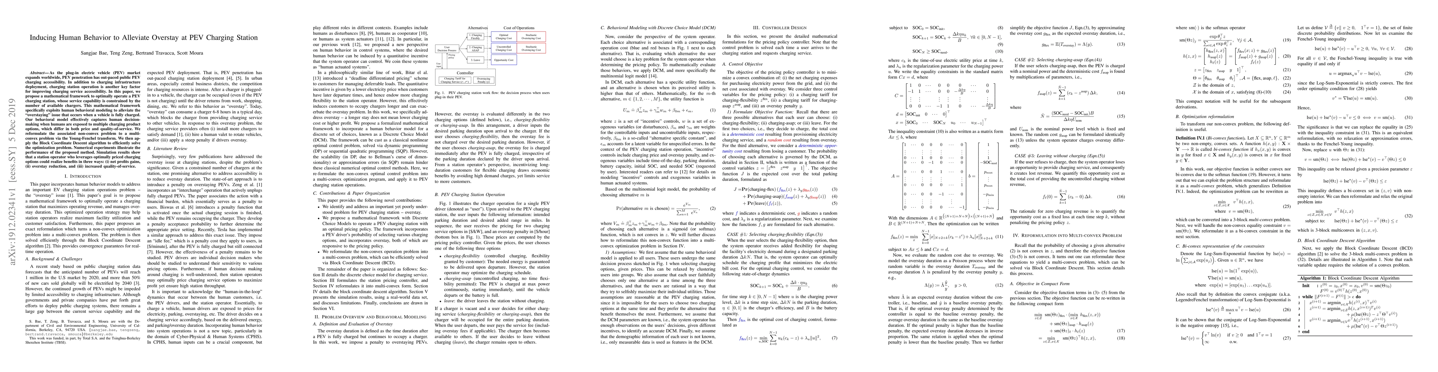 This paper proposes a mathematical framework to optimize PEV charging station operations to reduce overstaying, leveraging human behavioral modeling to influence charging decisions. The framework reformulates a non-convex problem into a multi-convex problem and uses the Block Coordinate Descent algorithm for efficient solution, demonstrating improved net profits, reduced overstays, and enhanced service quality.