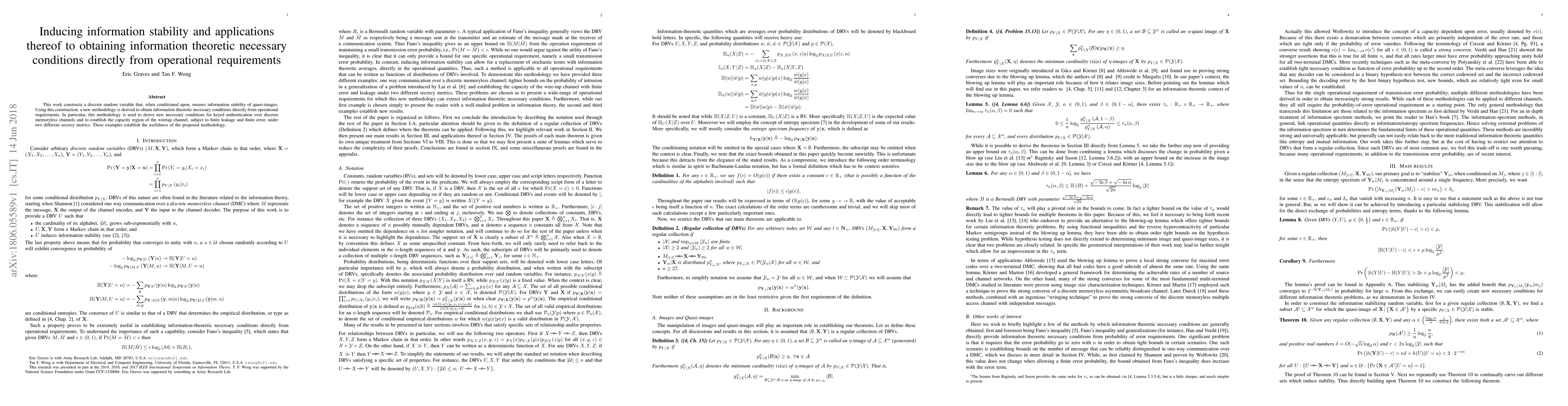 This work constructs a discrete random variable that, when conditioned upon, ensures information stability of quasi-images. Using this construction, a new methodology is derived to obtain information theoretic necessary conditions directly from operational requirements. In particular, this methodology is used to derive new necessary conditions for keyed authentication over discrete memoryless channels and to establish the capacity region of the wiretap channel, subject to finite leakage and finite error, under two different secrecy metrics. These examples establish the usefulness of the proposed methodology.