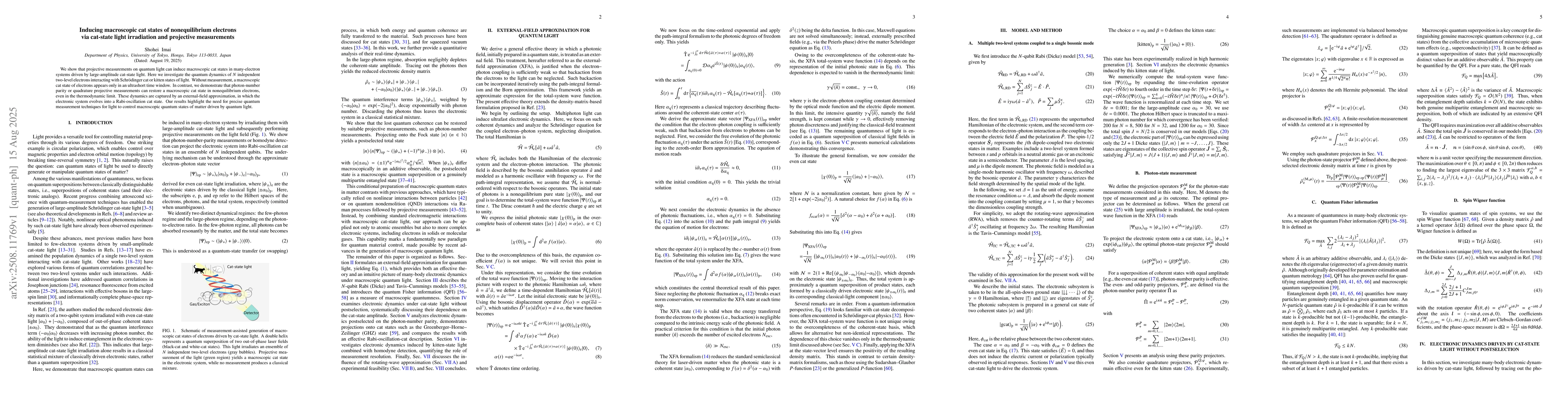 The paper introduces a method for inducing macroscopic cat states in many-electron systems using projective measurements on quantum light, supported by the Tavis-Cummings model and quantum Rabi/Dick model.