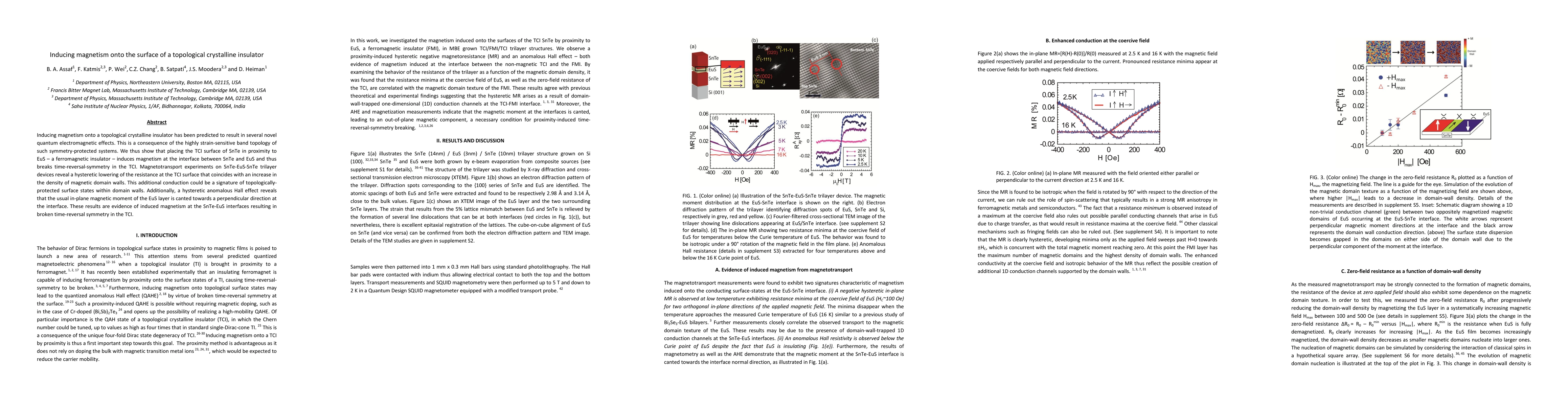 This study demonstrates that placing the SnTe surface of a topological crystalline insulator in proximity to EuS, a ferromagnetic insulator, induces magnetism at the interface, breaking time-reversal symmetry. Magnetotransport experiments on SnTe-EuS-SnTe trilayers show a hysteretic resistance lowering and increased magnetic domain walls, indicating topologically-protected surface states within domain walls.