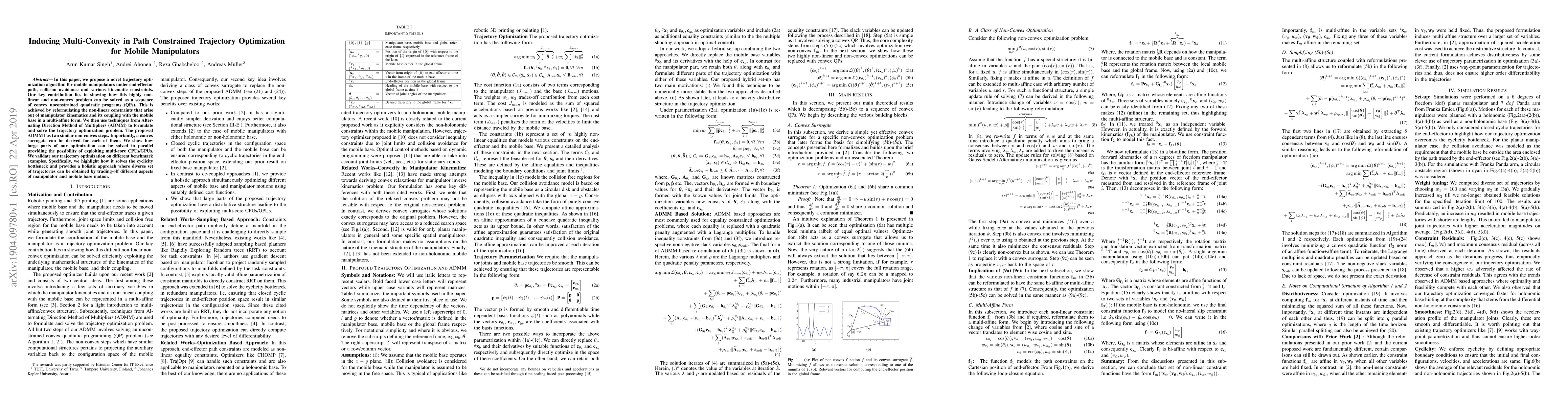 This paper introduces a novel trajectory optimization algorithm for mobile manipulators that transforms a complex, non-convex problem into a series of convex unconstrained quadratic programs using ADMM. The method leverages multi-affine reformulation and parallel computation to address path constraints and cyclicity issues.