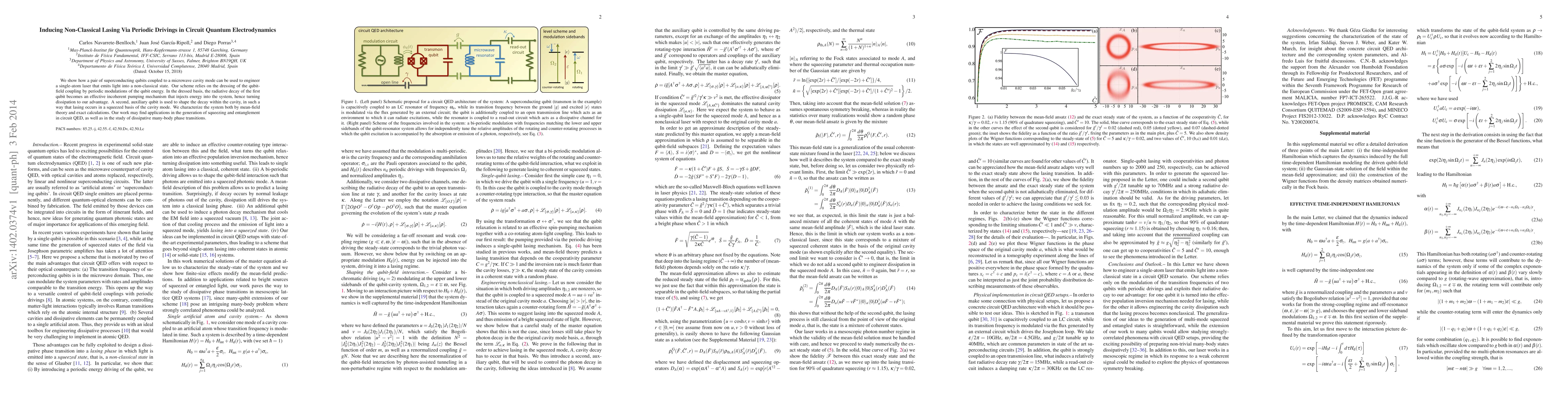 We show how a pair of superconducting qubits coupled to a microwave cavity mode can be used to engineer a single-atom laser that emits light into a non-classical state. Our scheme relies on the dressing of the qubit-field coupling by periodic modulations of the qubit energy. In the dressed basis, the radiative decay of the first qubit becomes an effective incoherent pumping mechanism that injects energy into the system, hence turning dissipation to our advantage. A second, auxiliary qubit is used to shape the decay within the cavity, in such a way that lasing occurs in a squeezed basis of the cavity mode. We characterize the system both by mean-field theory and exact calculations. Our work may find applications in the generation of squeezing and entanglement in circuit QED, as well as in the study of dissipative many-body phase transitions.
