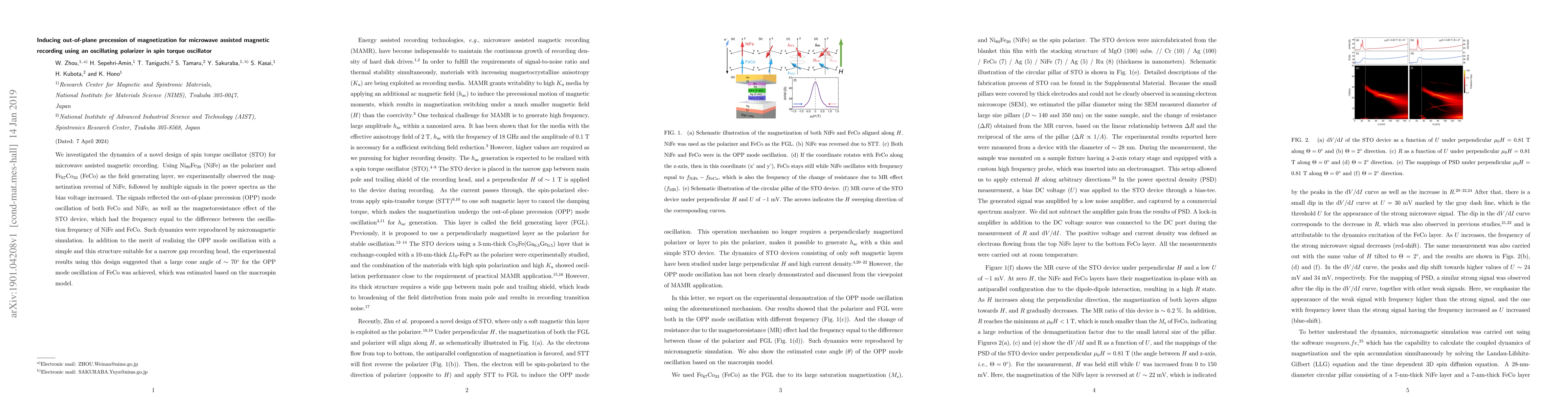 This paper explores a novel spin torque oscillator design for microwave-assisted magnetic recording, utilizing an oscillating polarizer to induce out-of-plane precession. Experimental results show the magnetization reversal of NiFe and multiple power spectrum signals reflecting the oscillation dynamics, validated by micromagnetic simulations.