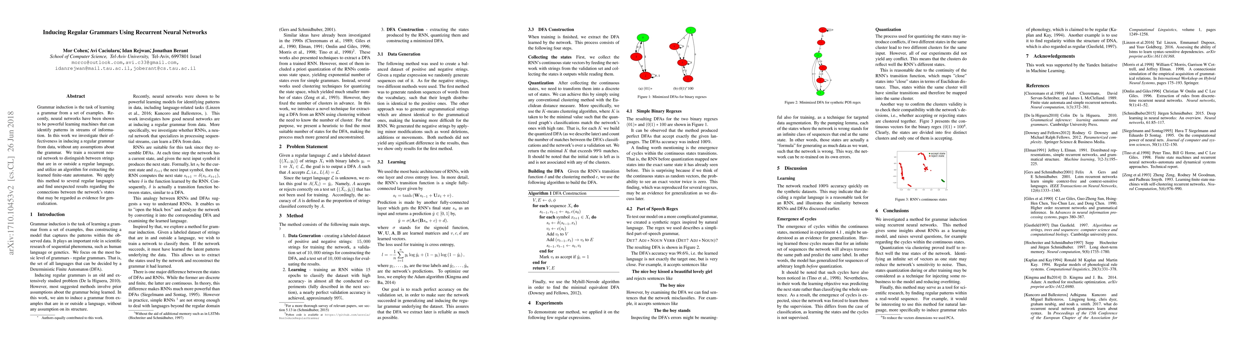 This research is significant as it investigates the use of recurrent neural networks (RNNs) for grammar induction, providing insights into RNNs as pattern-learning models and raising questions about cycles in continuous states.