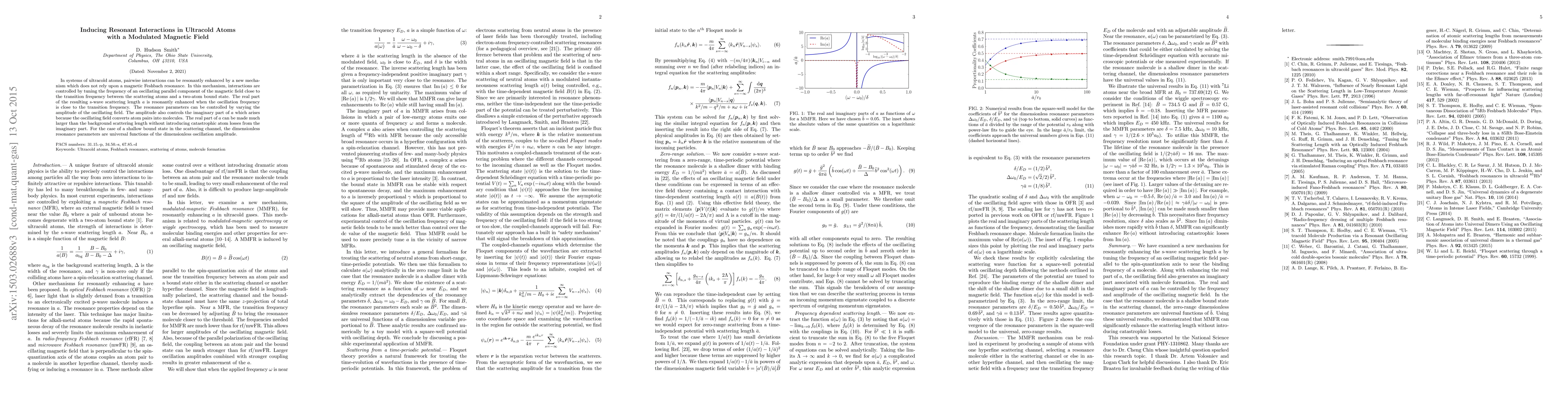 In systems of ultracold atoms, pairwise interactions can be resonantly enhanced by a new mechanism which does not rely upon a magnetic Feshbach resonance. In this mechanism, interactions are controlled by tuning the frequency of an oscillating parallel component of the magnetic field close to the transition frequency between the scattering atoms and a two-atom bound state. The real part of the resulting s-wave scattering length $a$ is resonantly enhanced when the oscillation frequency is close to the transition frequency. The resonance parameters can be controlled by varying the amplitude of the oscillating field. The amplitude also controls the imaginary part of $a$ which arises because the oscillating field converts atom pairs into molecules. The real part of $a$ can be made much larger than the background scattering length without introducing catastrophic atom losses from the imaginary part. For the case of a shallow bound state in the scattering channel, the dimensionless resonance parameters are universal functions of the dimensionless oscillation amplitude.