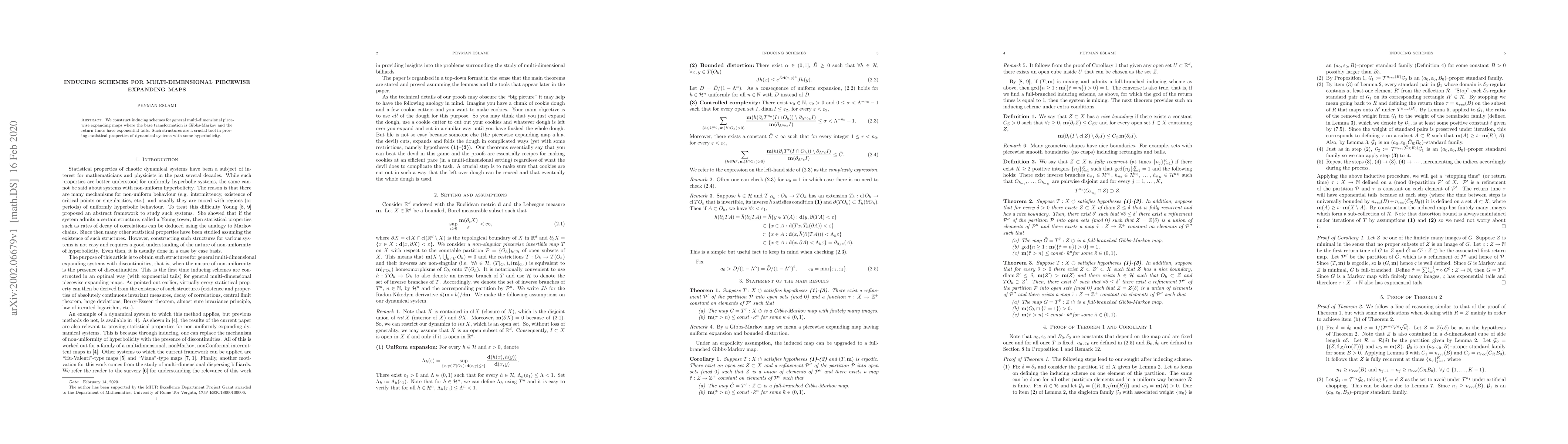 Summary: This paper develops inducing schemes for multi-dimensional piecewise expanding maps, focusing on Gibbs-Markov base transformations and maps with exponential return time tails, essential for establishing statistical properties in hyperbolic dynamical systems.