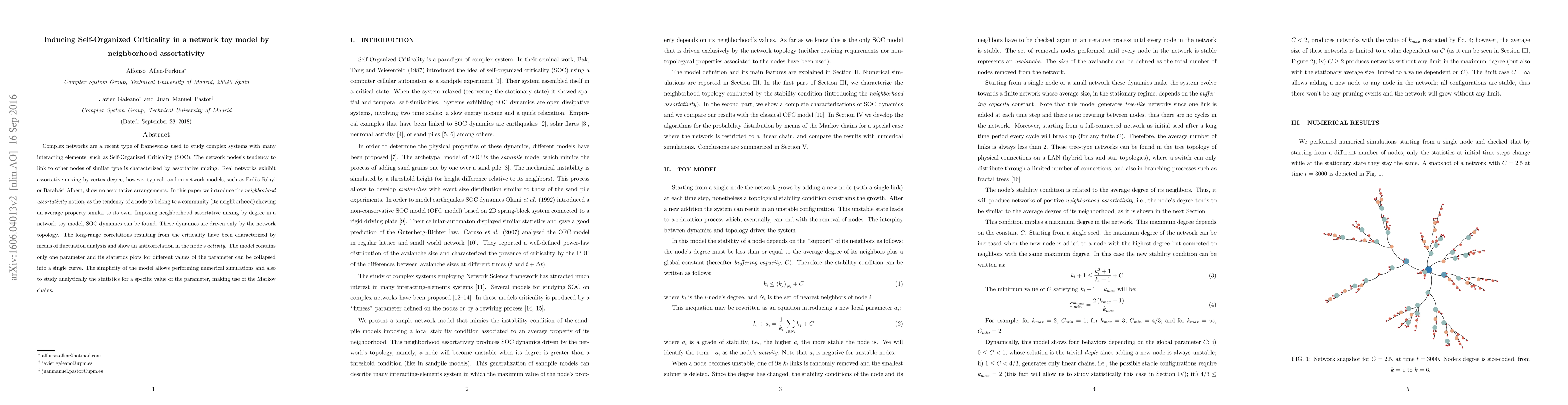 This paper explores a network toy model where self-organized criticality (SOC) is induced through neighborhood assortativity by degree. The model demonstrates long-range correlations and anticorrelation in node activity, with a single parameter allowing for analytical and numerical study.