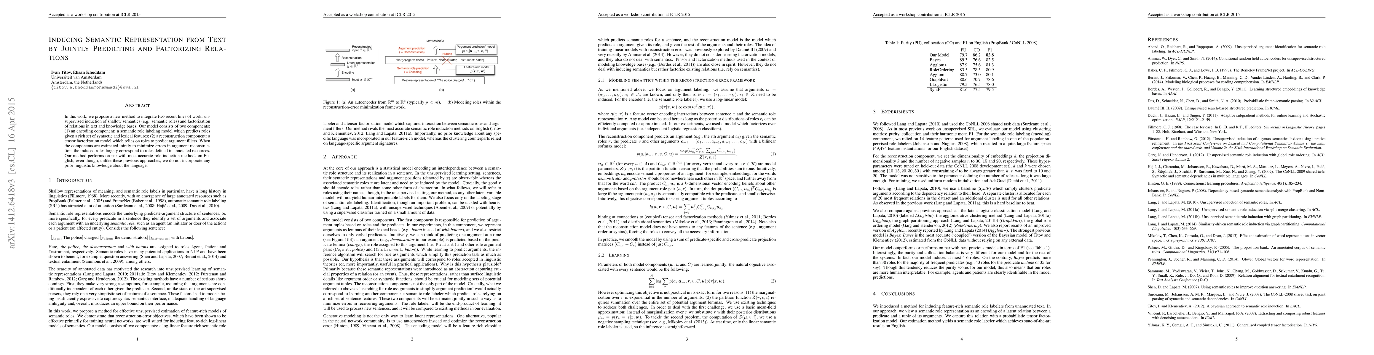 In this work, we propose a new method to integrate two recent lines of work: unsupervised induction of shallow semantics (e.g., semantic roles) and factorization of relations in text and knowledge bases. Our model consists of two components: (1) an encoding component: a semantic role labeling model which predicts roles given a rich set of syntactic and lexical features; (2) a reconstruction component: a tensor factorization model which relies on roles to predict argument fillers. When the components are estimated jointly to minimize errors in argument reconstruction, the induced roles largely correspond to roles defined in annotated resources. Our method performs on par with most accurate role induction methods on English, even though, unlike these previous approaches, we do not incorporate any prior linguistic knowledge about the language.