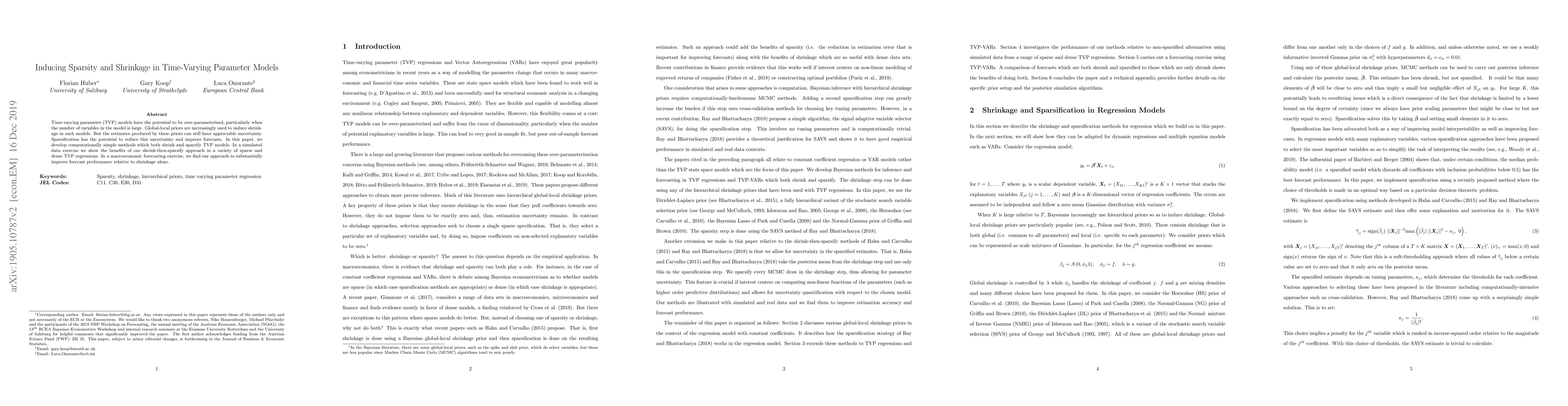 This paper develops computationally simple methods to shrink and sparsify time-varying parameter models, showing improved forecast performance over traditional shrinkage techniques in both simulated and macroeconomic data. The shrink-then-sparsify approach reduces uncertainty and enhances prediction accuracy.