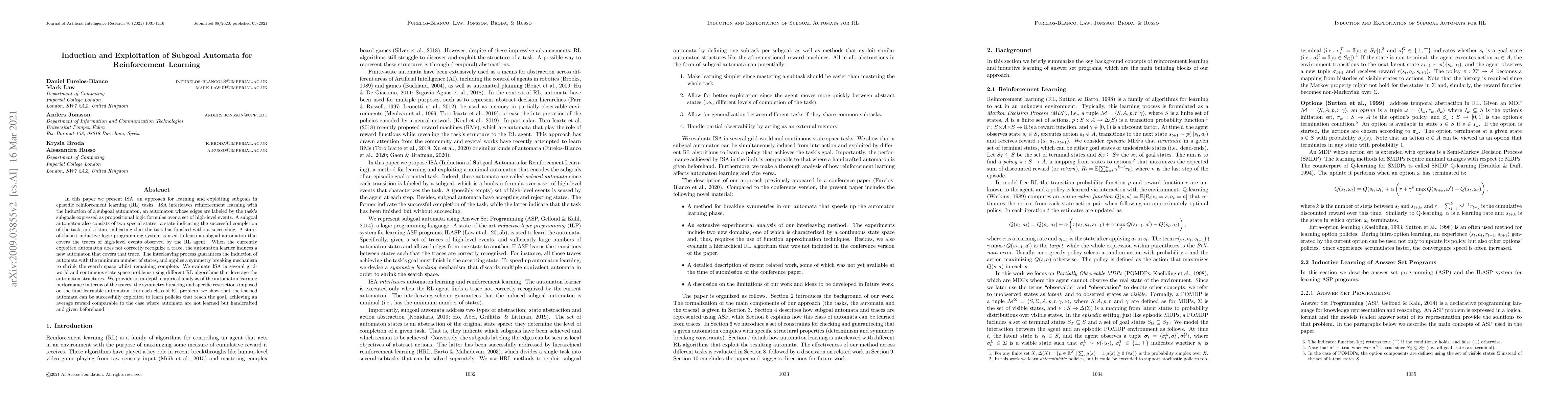 This paper introduces ISA, a method for learning and utilizing subgoal automata in reinforcement learning tasks. It interleaves reinforcement learning with the induction of subgoal automata to recognize high-level event sequences, leveraging an inductive logic programming system to minimize states and apply symmetry breaking. Empirical evaluations show that the learned automata can effectively guide RL agents to achieve goals, matching the performance of handcrafted automata.