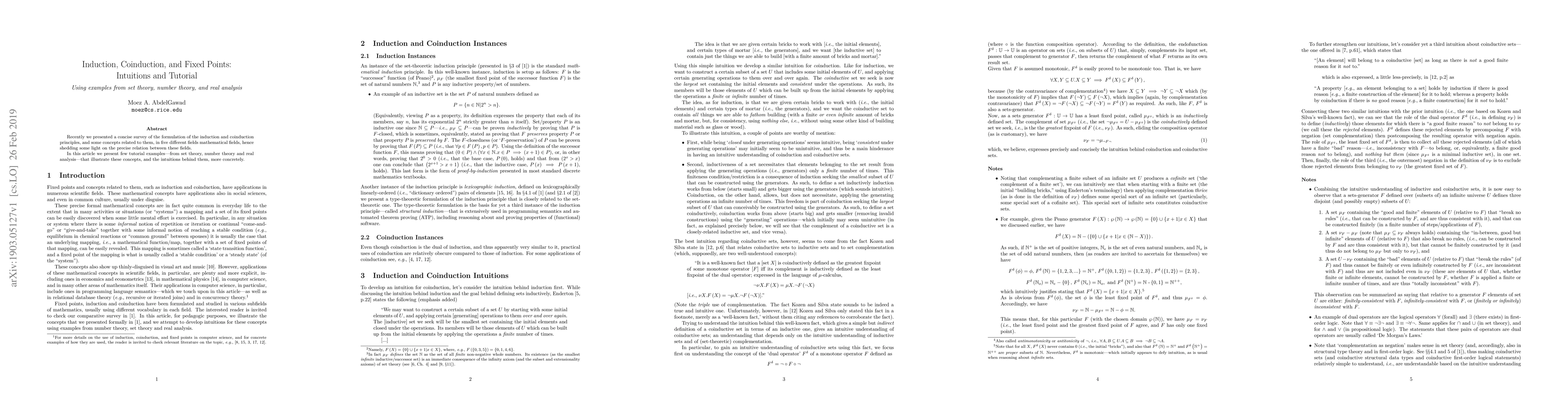 Recently we presented a concise survey of the formulation of the induction and coinduction principles, and some concepts related to them, in five different fields mathematical fields, hence shedding some light on the precise relation between these fields. In this article we present few tutorial examples---from set theory, number theory and real analysis---that illustrate these concepts, and the intuitions behind them, more concretely.