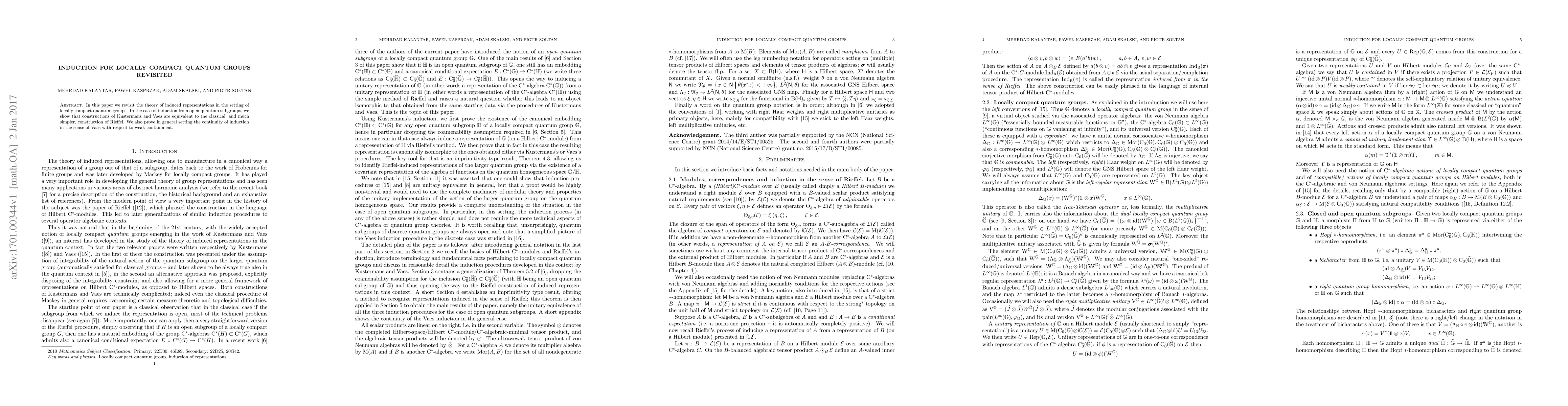 This paper revisits induced representations in locally compact quantum groups, demonstrating the equivalence of Kustermans and Vaes' constructions to Rieffel's classical method for induction from open quantum subgroups, and proves the continuity of Vaes' induction concerning weak containment.