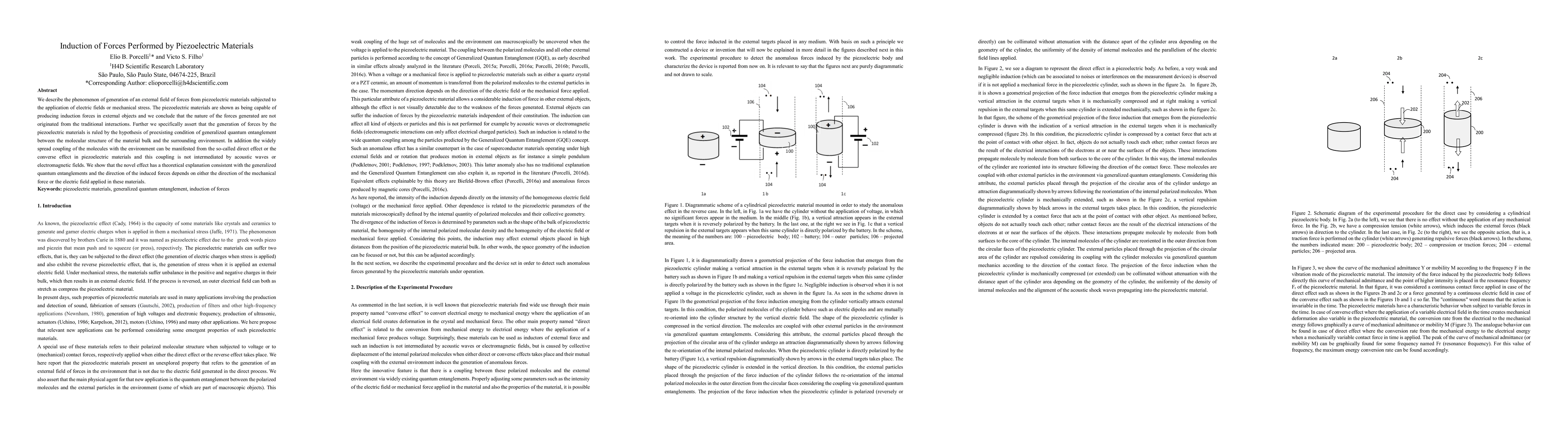 We describe the phenomenon of generation of an external field of forces from piezoelectric materials subjected to the application of electric fields or mechanical stress. The piezoelectric materials are shown as being capable of producing induction forces in external objects and we conclude that the nature of the forces generated are not originated from the traditional interactions. Further we specifically assert that the generation of forces by the piezoelectric materials is ruled by the hypothesis of preexisting condition of generalized quantum entanglement between the molecular structure of the material bulk and the surrounding environment. In addition the widely spread coupling of the molecules with the environment can be manifested from the so-called direct effect or the converse effect in piezoelectric materials and this coupling is not intermediated by acoustic waves or electromagnetic fields. We show that the novel effect has a theoretical explanation consistent with the generalized quantum entanglements and the direction of the induced forces depends on either the direction of the mechanical force or the electric field applied in these materials.