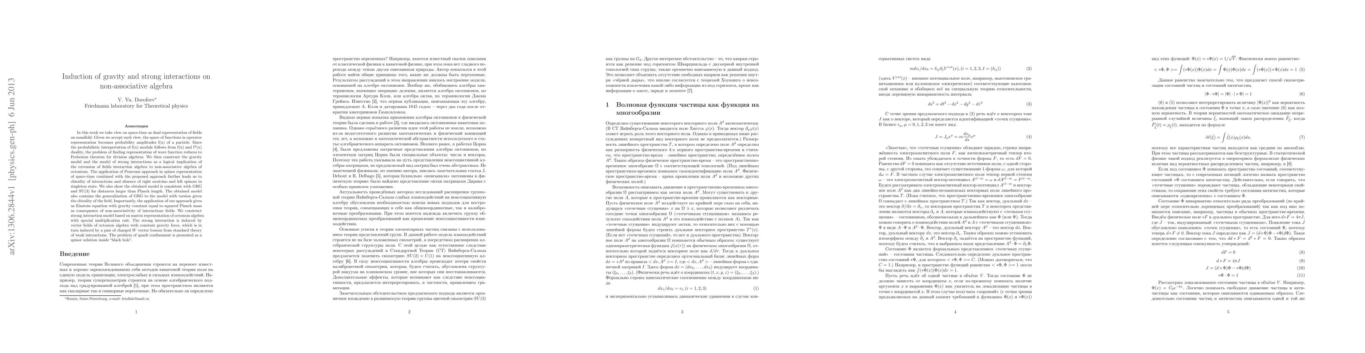 In this work we take view on space-time as dual representation of fields on manifold. Given we accept such view, the space of functions in operator representation becomes probability amplitudes f(x) of a particle. Since the probabilistic interpretation of f(x) module follows from f(x) and f*(x) duality, the problem of finding representation of wave function reduces to Frobenius theorem for division algebras. We then construct the gravity model and the model of strong interactions as a logical implication of the extension of fields interaction algebra to non-associative algebra of octonions. The application of Penrouse approach in spinor representation of space-time combined with the proposed approach further leads us to chirality of interactions and absence of right neutrino and left spinors in singleton state. We also show the obtained model is consistent with general theory of relativity and SU(3) for distances larger than Planck length. The obtained model also contains the generalization of general theory of relativity to the model with torsion given the chirality of the field. Importantly, the application of our approach gives us Einstein equation with gravity constant equal to squared Planck mass as consequence of non-associativity of interactions fields. We construct strong interaction model based on matrix representation of octonion algebra with special multiplication rule. The strong interaction is induced by vector fields of octonion algebra with constant gravity force, which is in turn induced by a pair of charged $W$ vector bosons from standard theory of weak interactions. The problem of quark confinement is presented as a spinor solution inside "black hole".