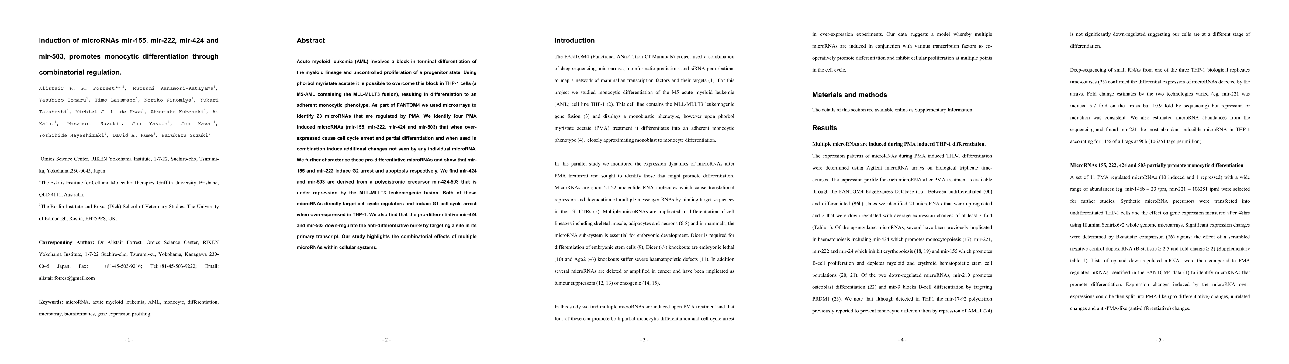 Acute myeloid leukemia (AML) involves a block in terminal differentiation of the myeloid lineage and uncontrolled proliferation of a progenitor state. Using phorbol myristate acetate (PMA), it is possible to overcome this block in THP-1 cells (an M5-AML containing the MLL-MLLT3 fusion), resulting in differentiation to an adherent monocytic phenotype. As part of FANTOM4, we used microarrays to identify 23 microRNAs that are regulated by PMA. We identify four PMA-induced micro- RNAs (mir-155, mir-222, mir-424 and mir-503) that when overexpressed cause cell-cycle arrest and partial differentiation and when used in combination induce additional changes not seen by any individual microRNA. We further characterize these prodifferentiative microRNAs and show that mir-155 and mir-222 induce G2 arrest and apoptosis, respectively. We find mir-424 and mir-503 are derived from a polycistronic precursor mir-424-503 that is under repression by the MLL-MLLT3 leukemogenic fusion. Both of these microRNAs directly target cell-cycle regulators and induce G1 cell-cycle arrest when overexpressed in THP-1. We also find that the pro-differentiative mir-424 and mir-503 downregulate the anti-differentiative mir-9 by targeting a site in its primary transcript. Our study highlights the combinatorial effects of multiple microRNAs within cellular systems.