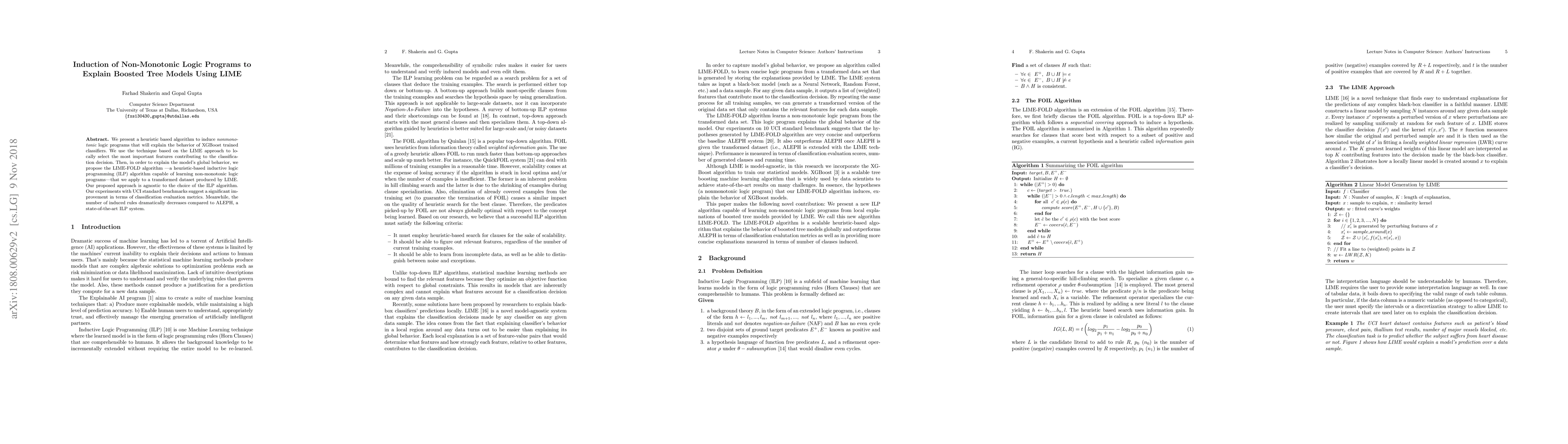 This paper introduces a heuristic algorithm for inducing non-monotonic logic programs to explain XGBoost classifiers using LIME, proposing the LIME-FOLD algorithm for global behavior explanation. Experiments show improved classification metrics and fewer induced rules compared to ALEPH.