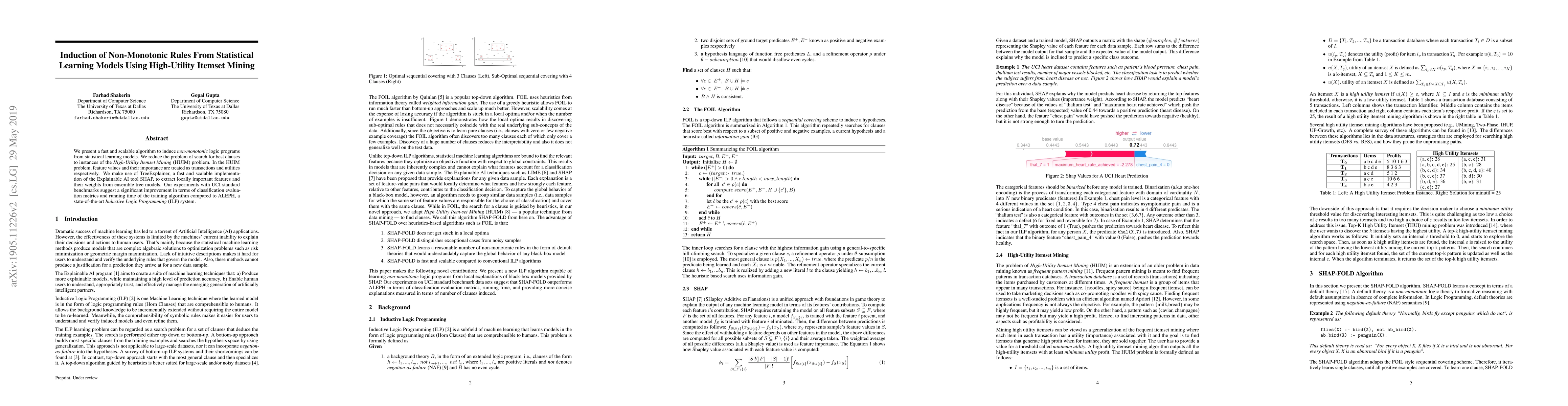 We present a fast and scalable algorithm to induce non-monotonic logic programs from statistical learning models. We reduce the problem of search for best clauses to instances of the High-Utility Itemset Mining (HUIM) problem. In the HUIM problem, feature values and their importance are treated as transactions and utilities respectively. We make use of TreeExplainer, a fast and scalable implementation of the Explainable AI tool SHAP, to extract locally important features and their weights from ensemble tree models. Our experiments with UCI standard benchmarks suggest a significant improvement in terms of classification evaluation metrics and running time of the training algorithm compared to ALEPH, a state-of-the-art Inductive Logic Programming (ILP) system.
