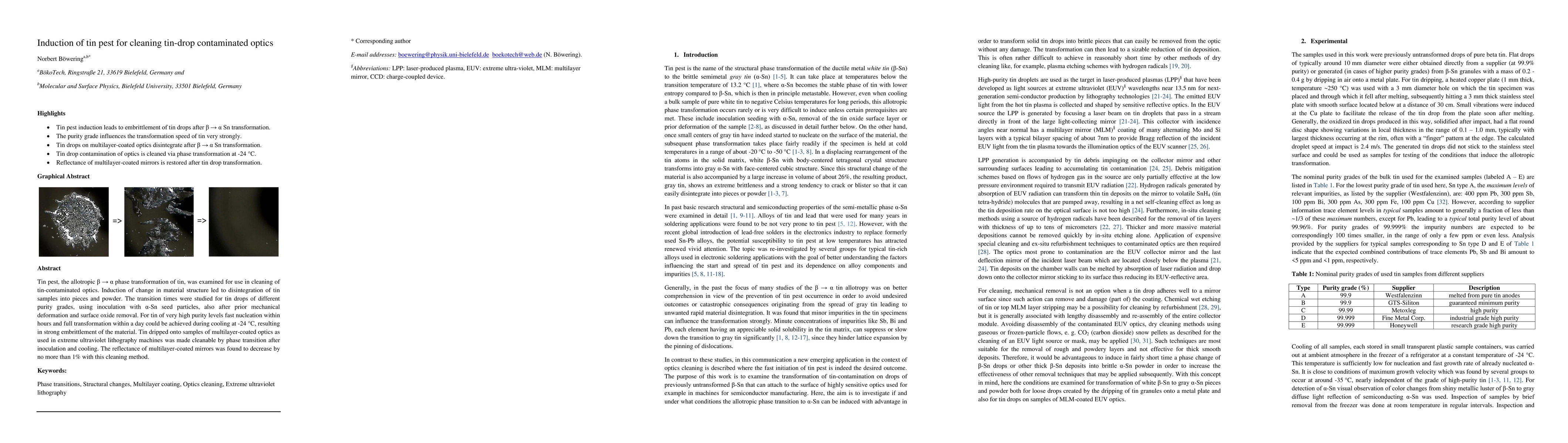 This study investigates tin pest, the phase transformation of tin, to clean tin-contaminated optics. The process induces rapid disintegration of tin, with high-purity tin transforming fully within a day at -24°C, allowing effective cleaning without significant loss of optical mirror reflectance.