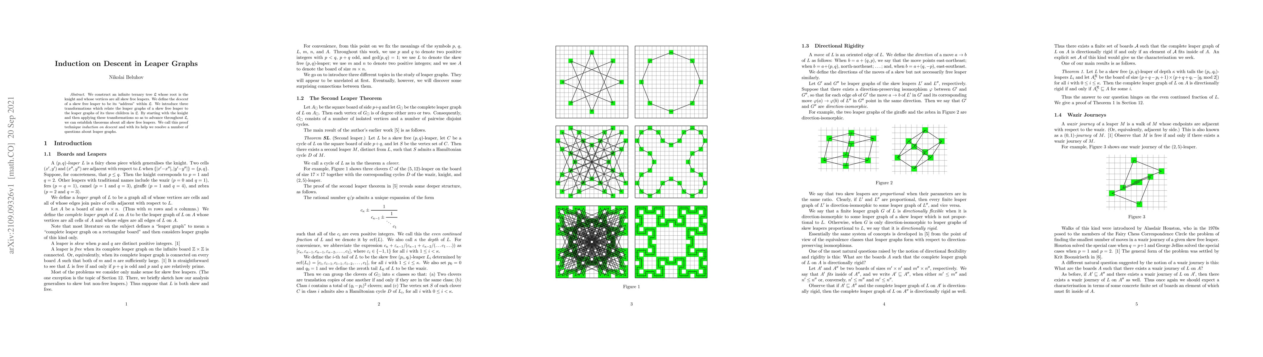 We construct an infinite ternary tree $\mathfrak{L}$ whose root is the knight and whose vertices are all skew free leapers. We define the descent of a skew free leaper to be its "address" within $\mathfrak{L}$. We introduce three transformations which relate the leaper graphs of a skew free leaper to the leaper graphs of its three children in $\mathfrak{L}$. By starting with the knight and then applying these transformations so as to advance throughout $\mathfrak{L}$, we can establish theorems about all skew free leapers. We call this proof technique induction on descent and with its help we resolve a number of questions about leaper graphs.
