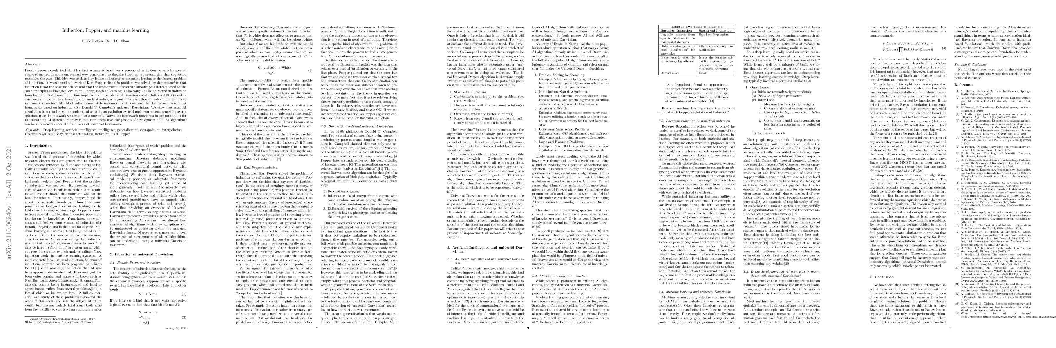 Francis Bacon popularized the idea that science is based on a process of induction by which repeated observations are, in some unspecified way, generalized to theories based on the assumption that the future resembles the past. This idea was criticized by Hume and others as untenable leading to the famous problem of induction. It wasn't until the work of Karl Popper that this problem was solved, by demonstrating that induction is not the basis for science and that the development of scientific knowledge is instead based on the same principles as biological evolution. Today, machine learning is also taught as being rooted in induction from big data. Solomonoff induction implemented in an idealized Bayesian agent (Hutter's AIXI) is widely discussed and touted as a framework for understanding AI algorithms, even though real-world attempts to implement something like AIXI immediately encounter fatal problems. In this paper, we contrast frameworks based on induction with Donald T. Campbell's universal Darwinism. We show that most AI algorithms in use today can be understood as using an evolutionary trial and error process searching over a solution space. In this work we argue that a universal Darwinian framework provides a better foundation for understanding AI systems. Moreover, at a more meta level the process of development of all AI algorithms can be understood under the framework of universal Darwinism.