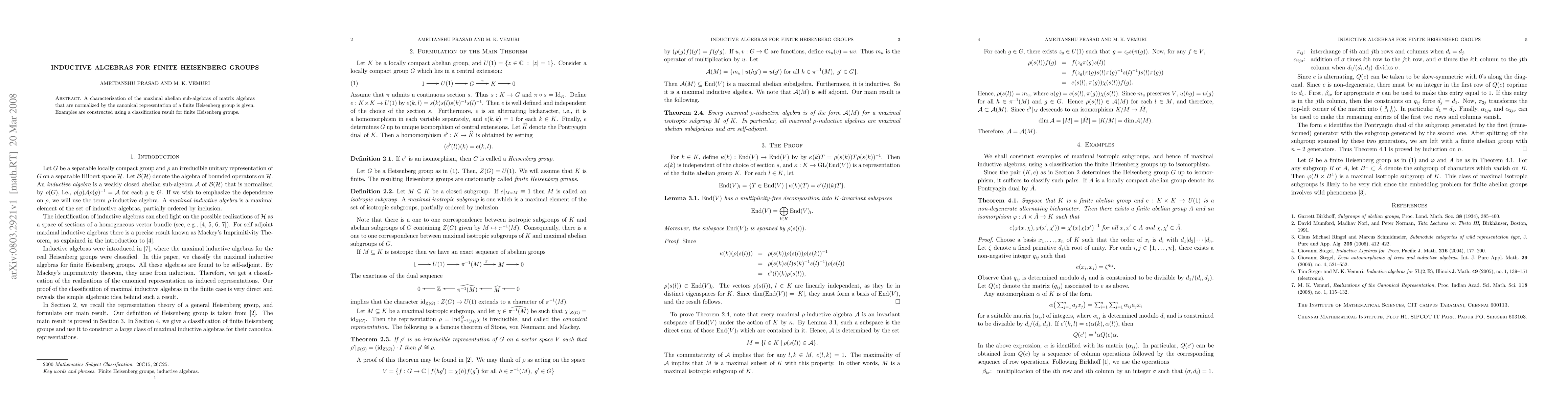 Summary: This paper characterizes the maximal abelian subalgebras of matrix algebras normalized by the finite Heisenberg group's canonical representation. It constructs examples based on a classification of finite Heisenberg groups.