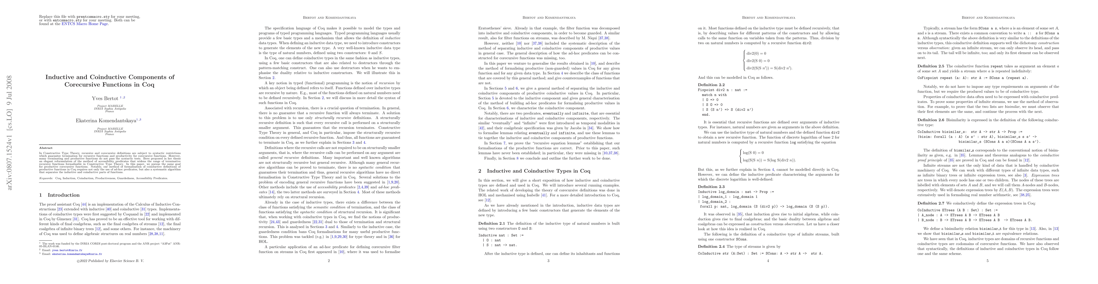 In Constructive Type Theory, recursive and corecursive definitions are subject to syntactic restrictions which guarantee termination for recursive functions and productivity for corecursive functions. However, many terminating and productive functions do not pass the syntactic tests. Bove proposed in her thesis an elegant reformulation of the method of accessibility predicates that widens the range of terminative recursive functions formalisable in Constructive Type Theory. In this paper, we pursue the same goal for productive corecursive functions. Notably, our method of formalisation of coinductive definitions of productive functions in Coq requires not only the use of ad-hoc predicates, but also a systematic algorithm that separates the inductive and coinductive parts of functions.
