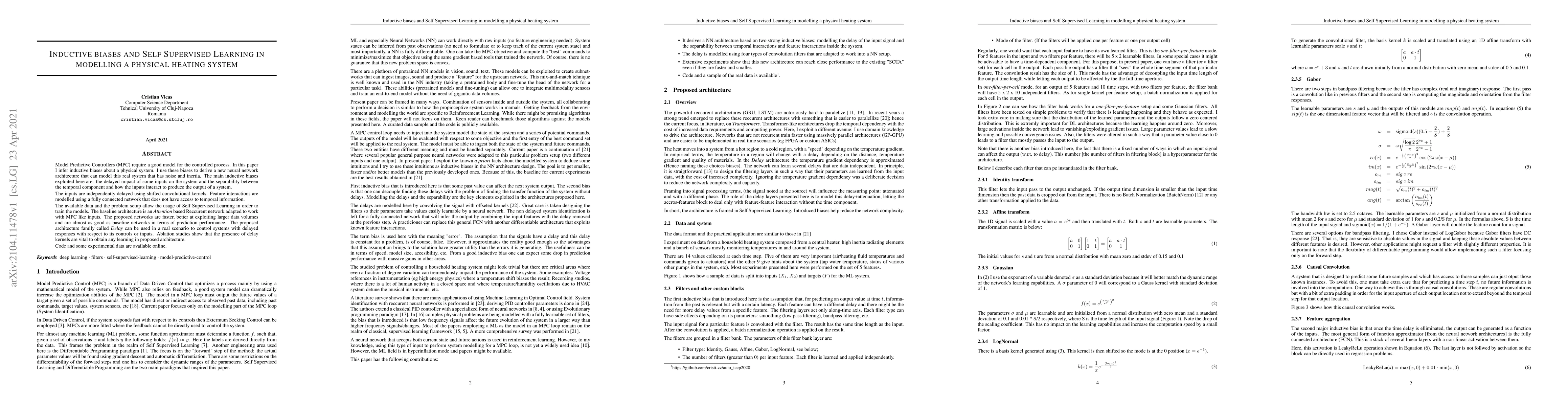 Model Predictive Controllers (MPC) require a good model for the controlled process. In this paper I infer inductive biases about a physical system. I use these biases to derive a new neural network architecture that can model this real system that has noise and inertia. The main inductive biases exploited here are: the delayed impact of some inputs on the system and the separability between the temporal component and how the inputs interact to produce the output of a system. The inputs are independently delayed using shifted convolutional kernels. Feature interactions are modelled using a fully connected network that does not have access to temporal information. The available data and the problem setup allow the usage of Self Supervised Learning in order to train the models. The baseline architecture is an Attention based Reccurent network adapted to work with MPC like inputs. The proposed networks are faster, better at exploiting larger data volumes and are almost as good as baseline networks in terms of prediction performance. The proposed architecture family called Delay can be used in a real scenario to control systems with delayed responses with respect to its controls or inputs. Ablation studies show that the presence of delay kernels are vital to obtain any learning in proposed architecture. Code and some experimental data are available online.