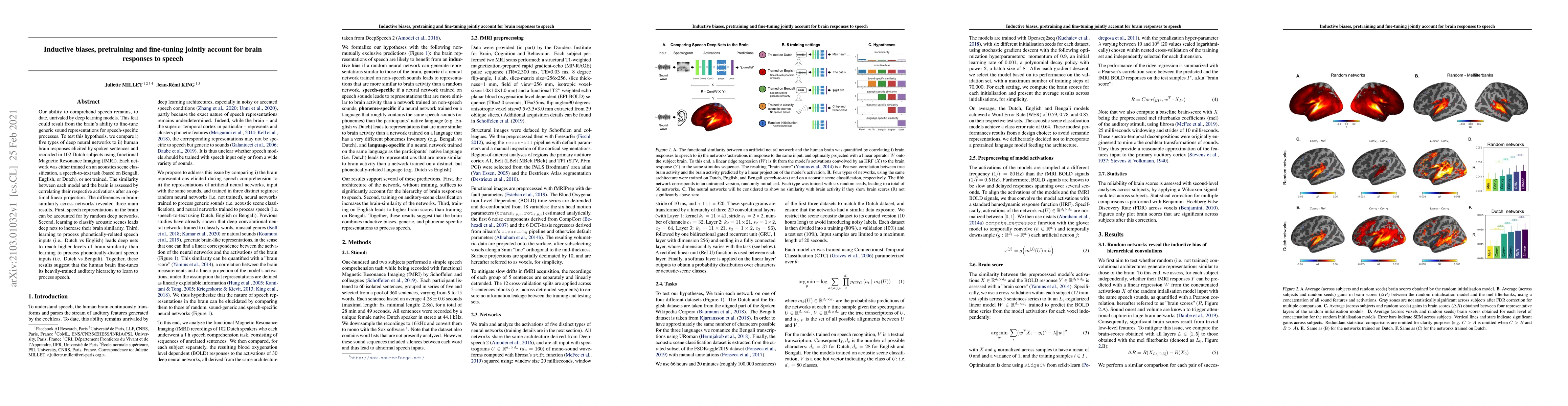 Our ability to comprehend speech remains, to date, unrivaled by deep learning models. This feat could result from the brain's ability to fine-tune generic sound representations for speech-specific processes. To test this hypothesis, we compare i) five types of deep neural networks to ii) human brain responses elicited by spoken sentences and recorded in 102 Dutch subjects using functional Magnetic Resonance Imaging (fMRI). Each network was either trained on an acoustics scene classification, a speech-to-text task (based on Bengali, English, or Dutch), or not trained. The similarity between each model and the brain is assessed by correlating their respective activations after an optimal linear projection. The differences in brain-similarity across networks revealed three main results. First, speech representations in the brain can be accounted for by random deep networks. Second, learning to classify acoustic scenes leads deep nets to increase their brain similarity. Third, learning to process phonetically-related speech inputs (i.e., Dutch vs English) leads deep nets to reach higher levels of brain-similarity than learning to process phonetically-distant speech inputs (i.e. Dutch vs Bengali). Together, these results suggest that the human brain fine-tunes its heavily-trained auditory hierarchy to learn to process speech.