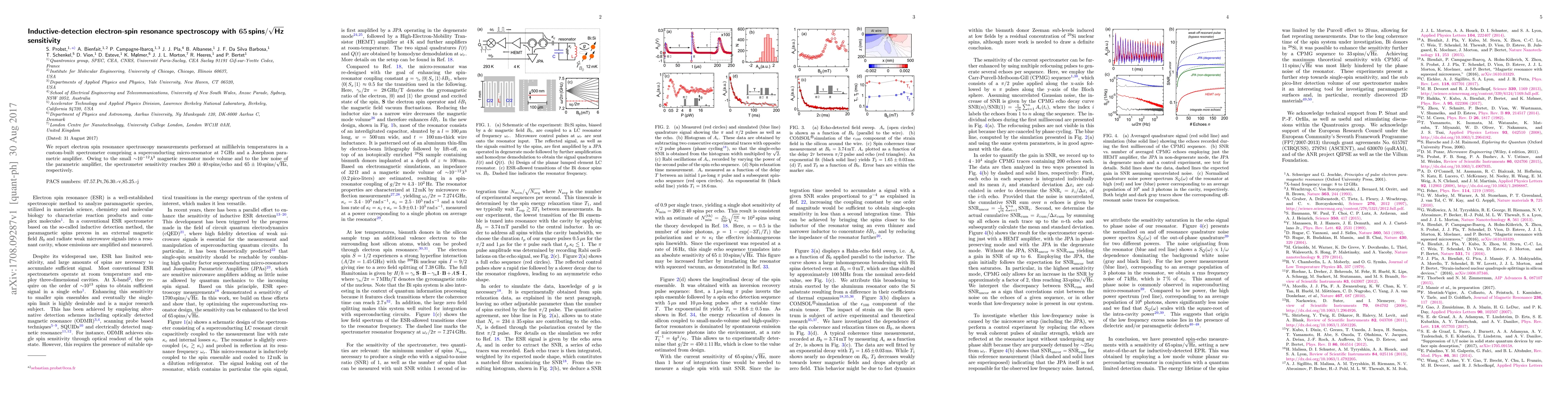 This paper details a highly sensitive electron spin resonance spectroscopy system operating at millikelvin temperatures, achieving a sensitivity of 65 spins per square root of hertz, facilitated by a superconducting micro-resonator and a Josephson parametric amplifier. The low noise and small resonator mode volume contribute to this exceptional sensitivity.