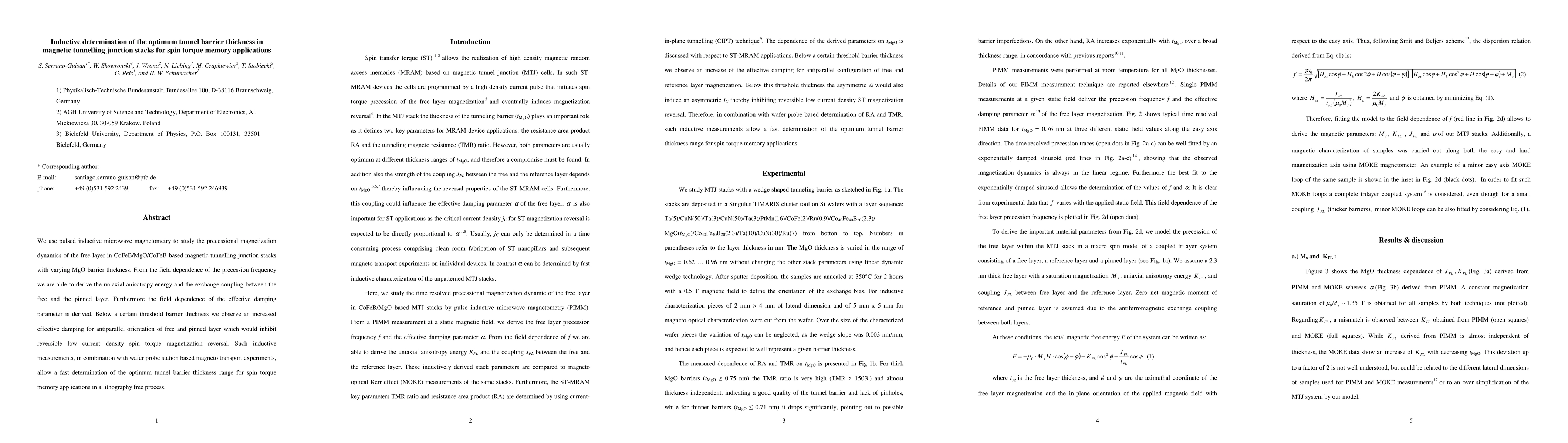 We use pulsed inductive microwave magnetometry to study the precessional magnetization dynamics of the free layer in CoFeB/MgO/CoFeB based magnetic tunnelling junction stacks with varying MgO barrier thickness. From the field dependence of the precession frequency we are able to derive the uniaxial anisotropy energy and the exchange coupling between the free and the pinned layer. Furthermore the field dependence of the effective damping parameter is derived. Below a certain threshold barrier thickness we observe an increased effective damping for antiparallel orientation of free and pinned layer which would inhibit reversible low current density spin torque magnetization reversal. Such inductive measurements, in combination with wafer probe station based magneto transport experiments, allow a fast determination of the optimum tunnel barrier thickness range for spin torque memory applications in a lithography free process.