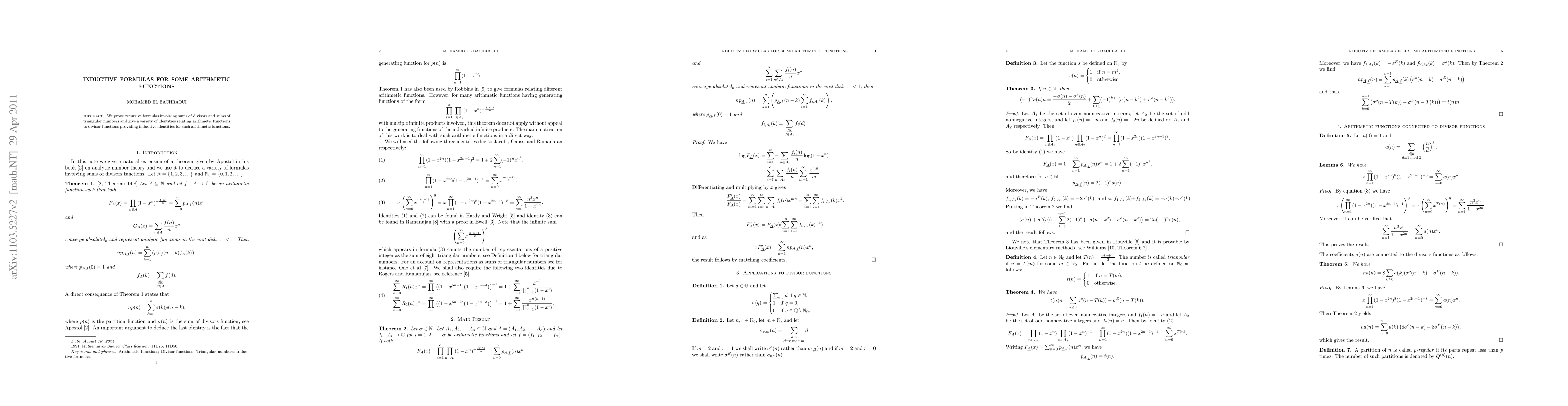 This paper establishes recursive formulas and identities for arithmetic functions through sums of divisors and triangular numbers, offering new inductive relationships for these functions.