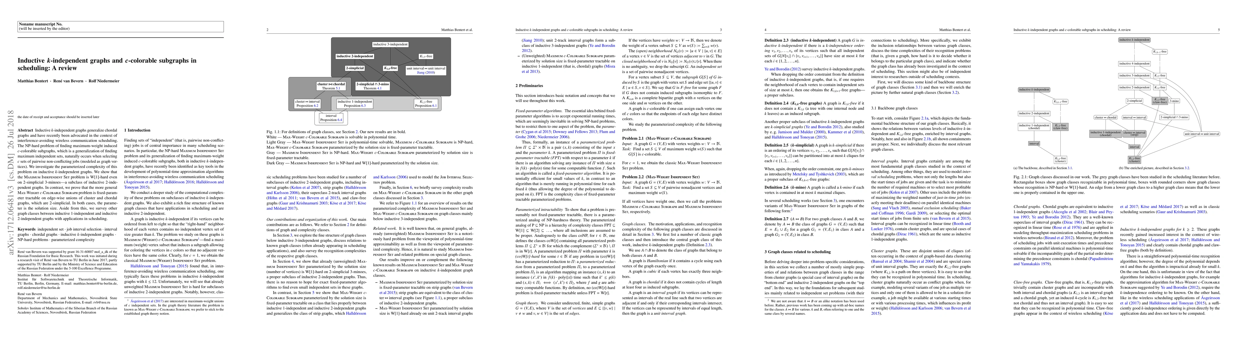 This paper reviews the use of inductive $k$-independent graphs in scheduling, focusing on the complexity of finding maximum-weight induced $c$-colorable subgraphs. It demonstrates that Independent Set remains W[1]-hard on a subclass of inductive 2-independent graphs, while Maximum $c$-Colorable Subgraph is fixed-parameter tractable on edge-wise unions of cluster and chordal graphs.