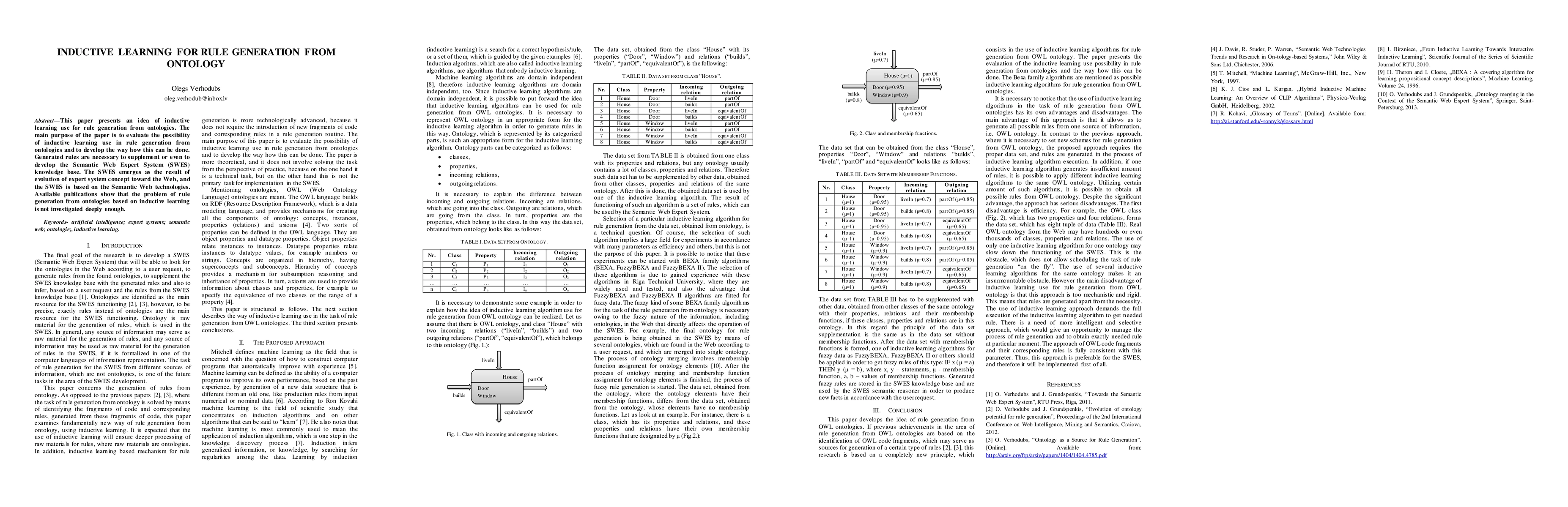 This paper presents an idea of inductive learning use for rule generation from ontologies. The main purpose of the paper is to evaluate the possibility of inductive learning use in rule generation from ontologies and to develop the way how this can be done. Generated rules are necessary to supplement or even to develop the Semantic Web Expert System (SWES) knowledge base. The SWES emerges as the result of evolution of expert system concept toward the Web, and the SWES is based on the Semantic Web technologies. Available publications show that the problem of rule generation from ontologies based on inductive learning is not investigated deeply enough.