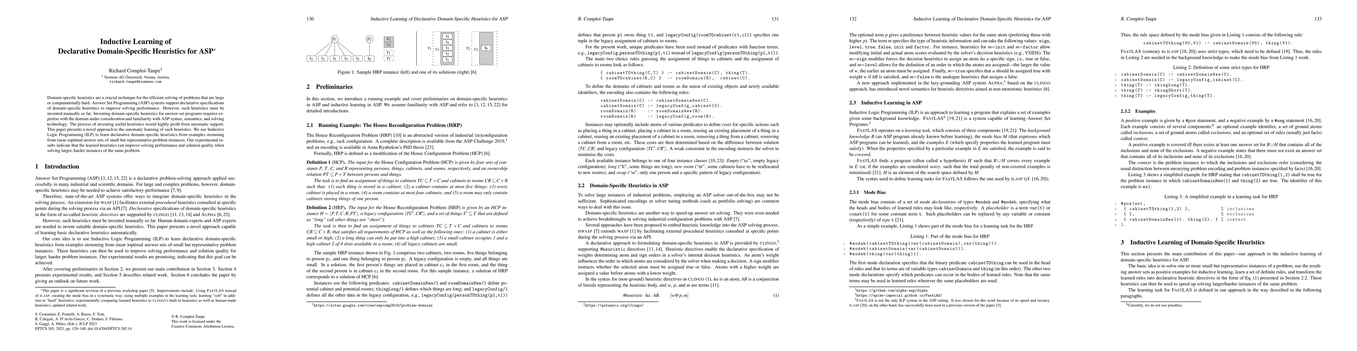 This paper introduces an automatic method using Inductive Logic Programming (ILP) to learn declarative domain-specific heuristics for Answer Set Programming (ASP). The learned heuristics, derived from examples of near-optimal solutions, enhance solving performance and solution quality for larger, more complex ASP problems.