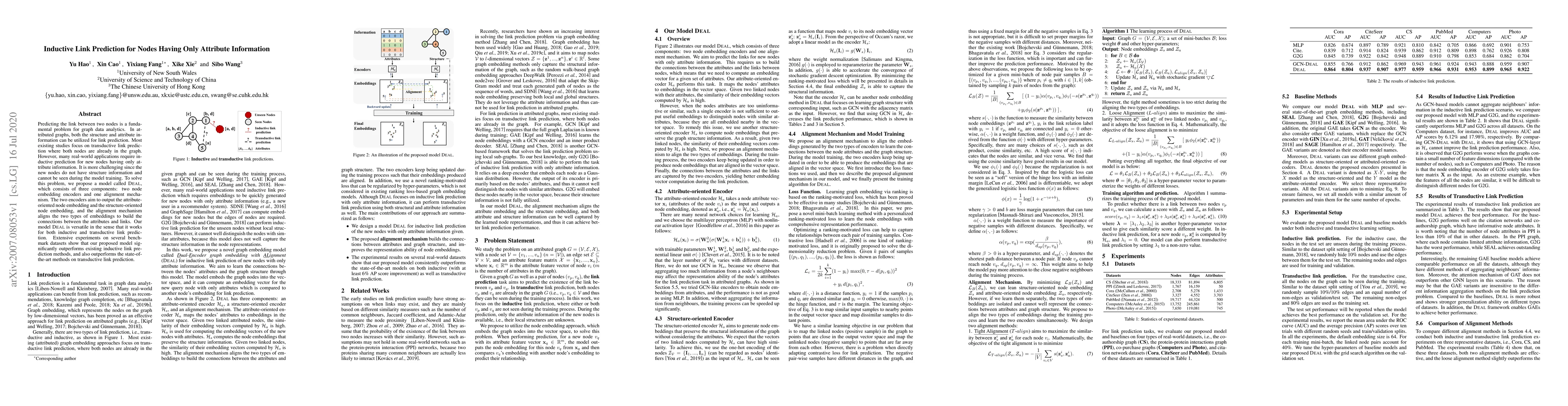 The paper proposes DEAL, a model for inductive link prediction for new nodes with only attribute information, using two node embedding encoders and an alignment mechanism. DEAL outperforms existing methods in both inductive and transductive link prediction tasks, as demonstrated by experiments on benchmark datasets.