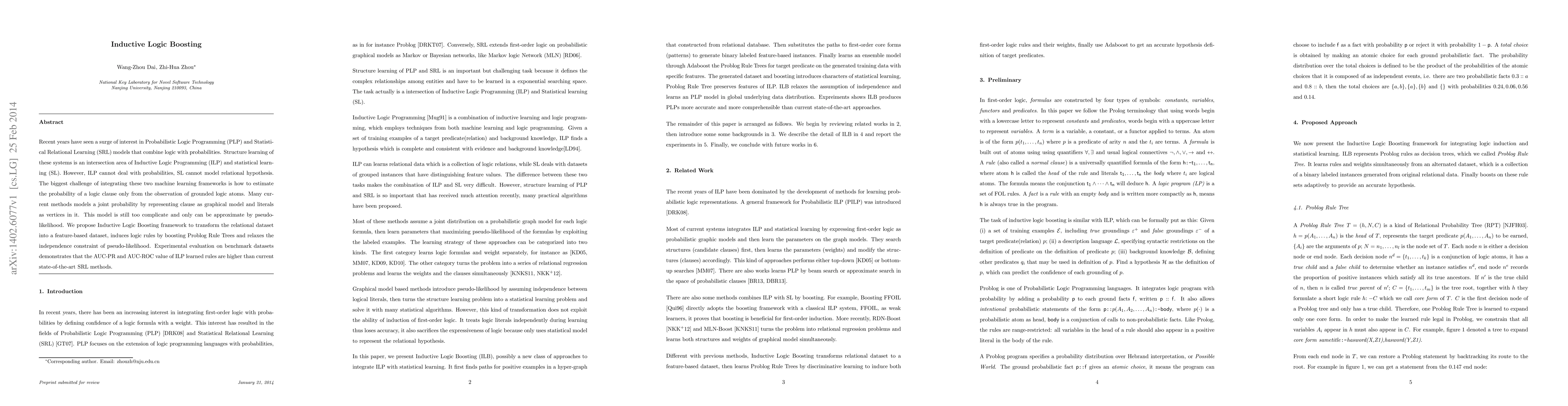 Recent years have seen a surge of interest in Probabilistic Logic Programming (PLP) and Statistical Relational Learning (SRL) models that combine logic with probabilities. Structure learning of these systems is an intersection area of Inductive Logic Programming (ILP) and statistical learning (SL). However, ILP cannot deal with probabilities, SL cannot model relational hypothesis. The biggest challenge of integrating these two machine learning frameworks is how to estimate the probability of a logic clause only from the observation of grounded logic atoms. Many current methods models a joint probability by representing clause as graphical model and literals as vertices in it. This model is still too complicate and only can be approximate by pseudo-likelihood. We propose Inductive Logic Boosting framework to transform the relational dataset into a feature-based dataset, induces logic rules by boosting Problog Rule Trees and relaxes the independence constraint of pseudo-likelihood. Experimental evaluation on benchmark datasets demonstrates that the AUC-PR and AUC-ROC value of ILP learned rules are higher than current state-of-the-art SRL methods.
