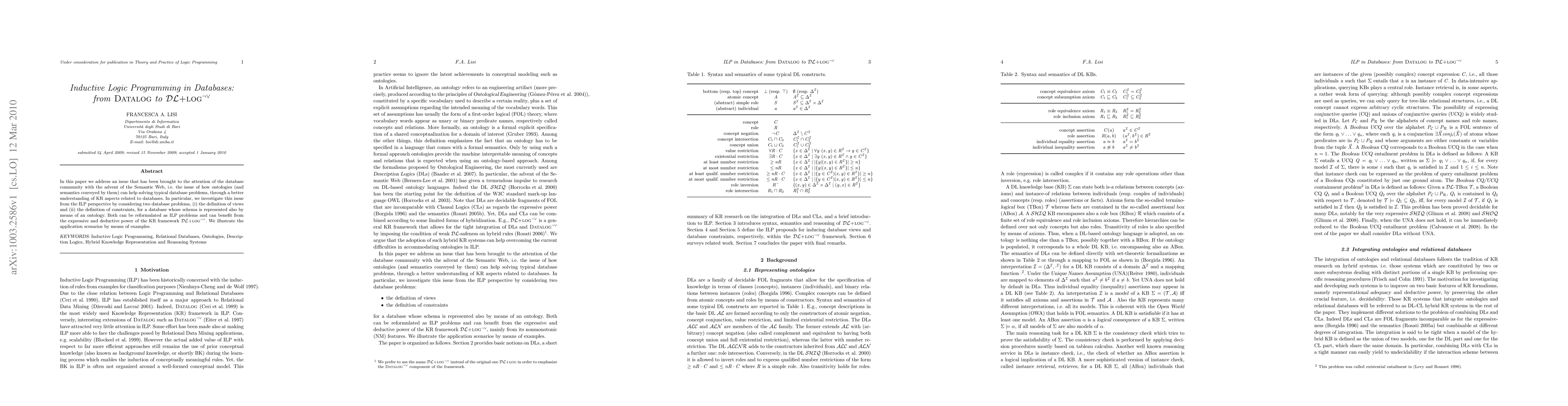This paper explores how ontologies can enhance database problem-solving through Inductive Logic Programming (ILP), focusing on defining views and constraints in databases represented with ontologies. The study leverages the expressiveness of DL+log for improved knowledge representation and reasoning.
